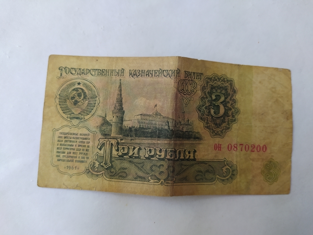 купюра-3 рубля СК9637633 ,1961года выпуска. Номинал-банкнота 3 рубля СССР — это денежная купюра, выпущенная в Советском Союзе, номиналом в три рубля. Банкнота — это вид денежного знака, печатный документ определенного номинала, выпускаемый центральным банком страны и имеющий обязательную платежную силу на её территории. Данная банкнота производилась на специализированных предприятиях Гознака, главным образом в Москве и Ленинграде , для печати использовали специальную бумагу ,изготовлена из хлопковых волокон ,что обеспечивало ей прочность и устойчивость к износу.