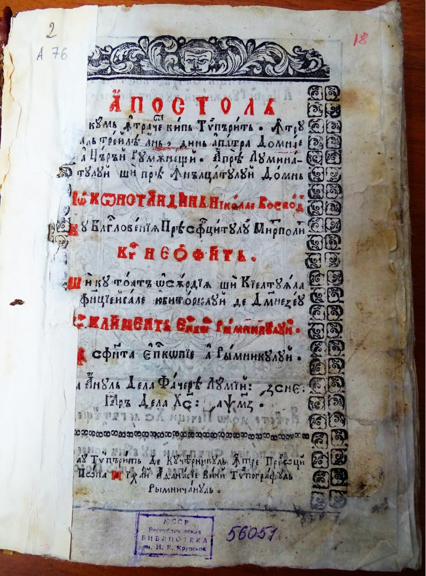 Apostol. Acum întracest chip tipărit. Întru al treilea an din a patra domnie a Țării Rumânești a prea Luminatului și prea Înălțatului Domn Io Costandin Nicolae Voevod. Cu blagoslovenia Prea Sfințitului Mitropolit Kyr Neofit, Și cu toată osârdiia și chieltuiala sfinției sale iubitoriului de Dumnezeu Kyr Climent Episcopul Râmnicului. În Sfânta Episcopie a Râmnicului. La anul de la Facerea lumii, 7255, iară de la Xc 1747. Sau typărit de cucearnicul între preoți Popa Mihai Atanasievici Tipograful Râmniceanul.