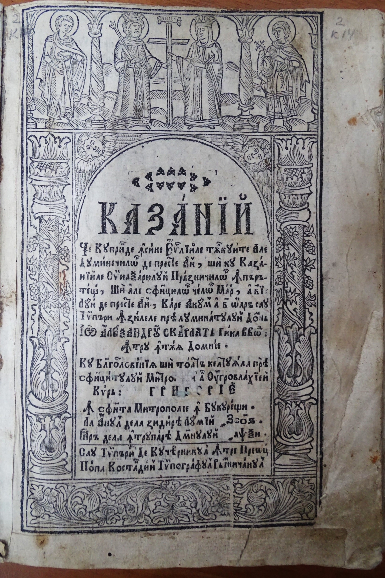 Cazanie. Ce cuprinde în sine Evangheliile tâlcuite ale duminecilor de preste an și cu Cazaniile Sinaxariului Praznicilor împărătești, și ale sfinților celor mari, a 12 luni de preste an, care Acum a 2 oară s-au Tipărit în zilele prea luminatului Domn Io Alexandru Scarlat Ghica Voievod. Întru întâia domnie. Cu Blagosloveniia și toată cheltuiala prea sfințitului Mitropolit al Ugrovlahiei Kyr Grigorie. În sfânta Mitropolie în București. La anul de la Zidirea Lumii 7276. iar de la întruparea Domnului 1768. Sau Tipărit de cucearnicul între Preoți popa Costandin Tipograful Râmniceanul.