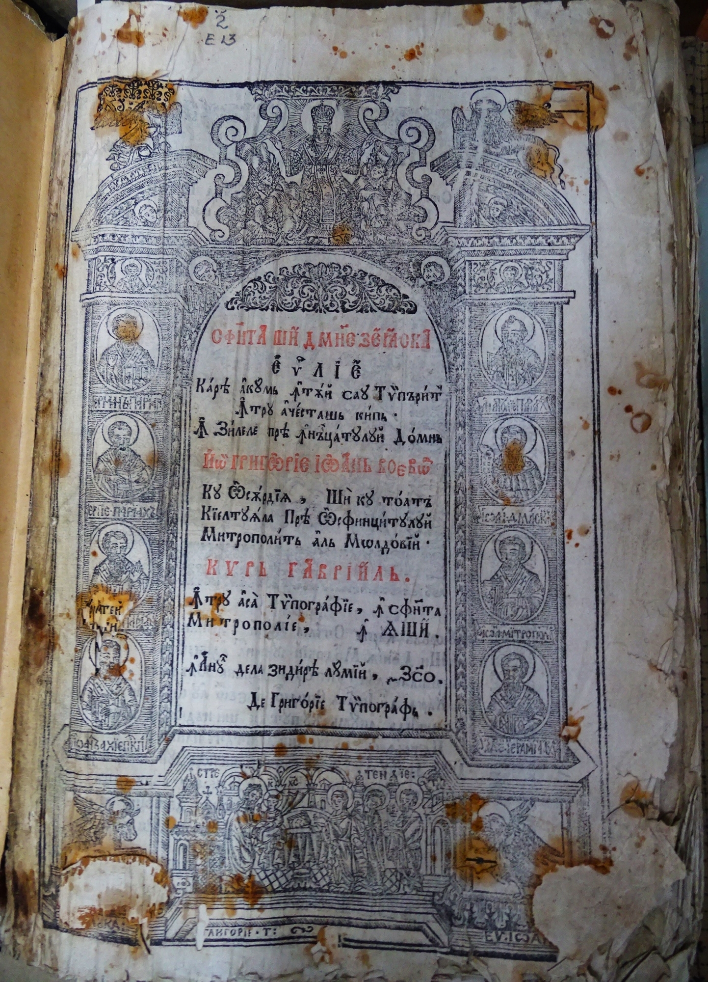 Sfânta și dumnezeiasca Ev(anghe)lie, care acum întâi s-au tipărit întru acestaș chip în zilele prea Înălțatului Domn Io Grigore Ioan Voievod. Cu osârdiia și cu toată chieltuiala preaosfințitului Mitropolit al Moldovii Kyr Gavriil, întru a sa tipografie, în sfânta Mitropolie, în Iași. În anul de la zidirea lumii, 7270 <1762>. de Grigorie (Stanovici) tipograf [și Sandu Bucureșteanul] ; [cu diorthosirea monahului Evloghie] ; [gravori: Mihail Strilbițchi și Theofan monahul]. Colofonul: „Tipăritu-s-au în anul dela mântuirea lumii 1762 de Grigorie Stanovici Tipograf. Cu cel împreună ostenitoriu și îndreptătoriu la tot lucrul Sandul Bucureșteanu. Și diorthositoriu Evloghie Monah” .Legătura originală din lemn în catifea neagră cu ferecătură pe coperta 1. Pe centru urmele unui medalion metalic. Lipsă cheutorile. Textul în chenar liniar dublu, în 2 coloane, tipărit cu negru și roșu câte 34 rânduri. Pagina de titlu încadrată într-o poartă ornamentală cu Iisus Hrisos binecuvântând pe frontispiciu, cu opt medalioane de sfinți pe cele două laturi, și o scenă religioasă în partea de jos a foii, cu însemnele celor patru Sf. Evangheliști în colțuri, semnată de Grigorie T., Sandul T. Pe verso foii de titlu stema Țării Moldovei cu stihuri asupra stemei. Inițiale decorate cu roșu, frontispicii vegetale, o gravură în plină pagină datată cu anul 1761, vinietă de final din antrelacuri.