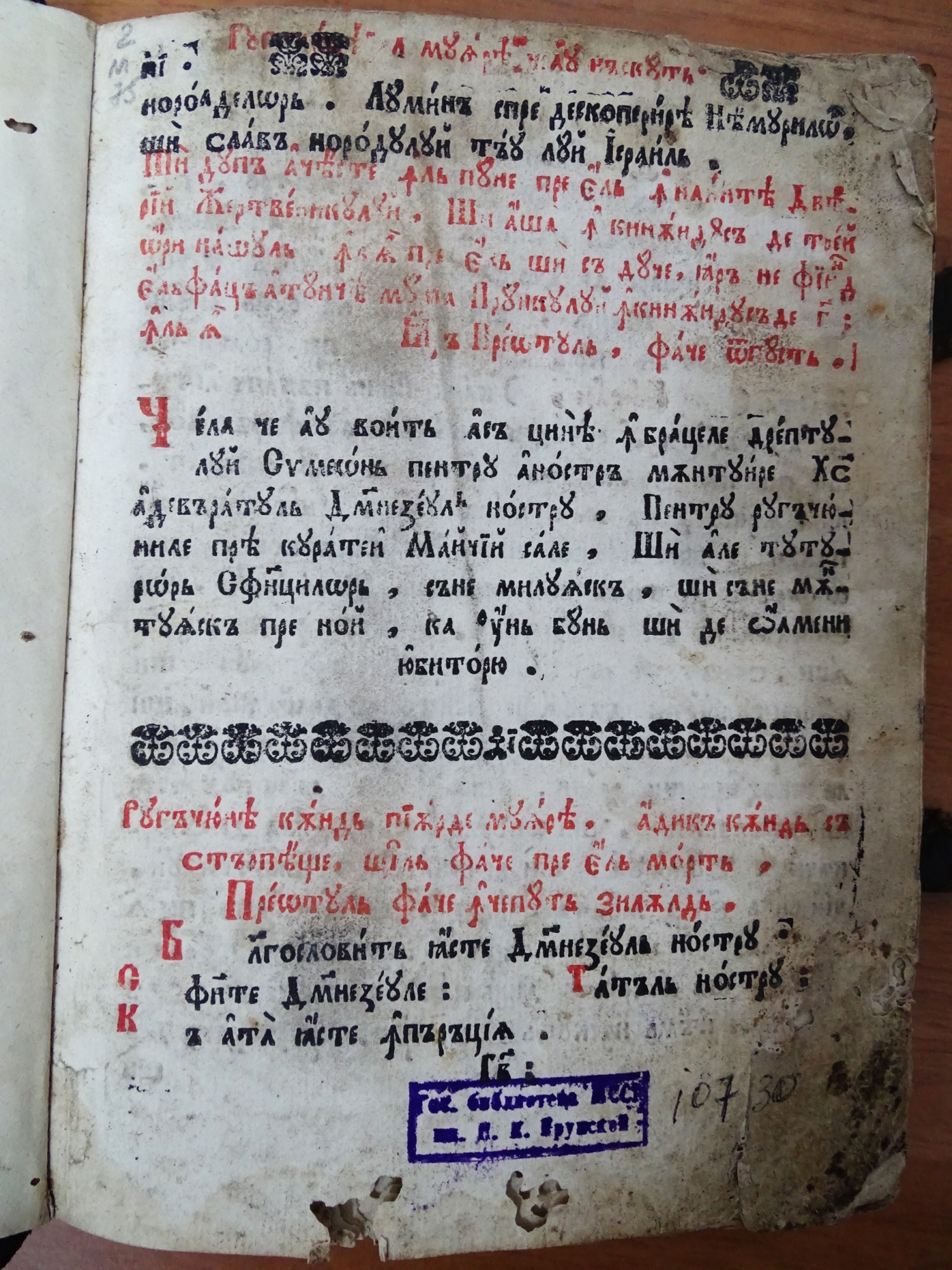 Legătura originală din lemn, îmbrăcată în piele de culoare cafenie, cu ornamente liniare ondulate, aplicate prin presare. Pe centru este imprimat semnul crucii. Cotorul cu 5 nervuri proeminente. Cheutorile din piele şi metal, defecte. Forzațurile confecționate din hârtie albă. Exemplar incomplet. lipsă pagina de titlu, filele 1-16, 793-827. Text pe o coloană, in negru şi roșu, cu 23, 24 de rânduri pe pagină. Inițiale ornate în roșu. Frontispicii din frunză de palmete. Finale din vrejuri. Foile 515-525 sunt numai cu negru. Insemnări: P. 450-458 „Aceasta carte anume Molitvenic esti a preutului Parthene of biserica şi am dat pe dansul 5 lei pol in zilele lui Ion Alexandru Grigori Ghica voievod. Velet 7273 <1765. Si slova Pashali imbla 1"