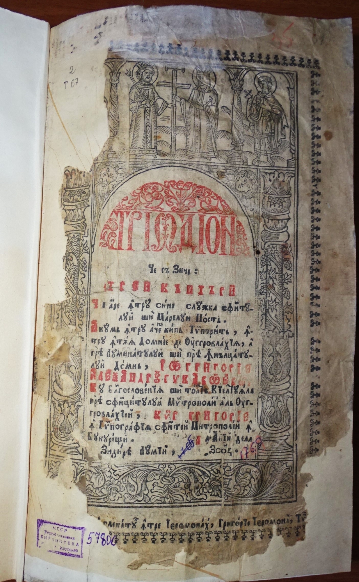 Triodion, ce să zice trei cântări, ce are întru sine slujba sfântului şi marelui post. Acum intru acest chip tipărit întru întâia domnie de Ungrovlahia a prea luminatului şi prea înălțatului domn Io Grigorie Alexandru Ghica Voievod. Cu blagoslovenia şi toată chieltuiala prea sfințitului Mitropolit al Ungrovlahiei chir Grigorie. In tipografia sfintei Mitropolii în Bucureşti. S-au tipărit de prea plecatul între ieromonahi Grigorie ieromonah tip(ograful). La anii de la zidirea lumii 7277 <1769>.
