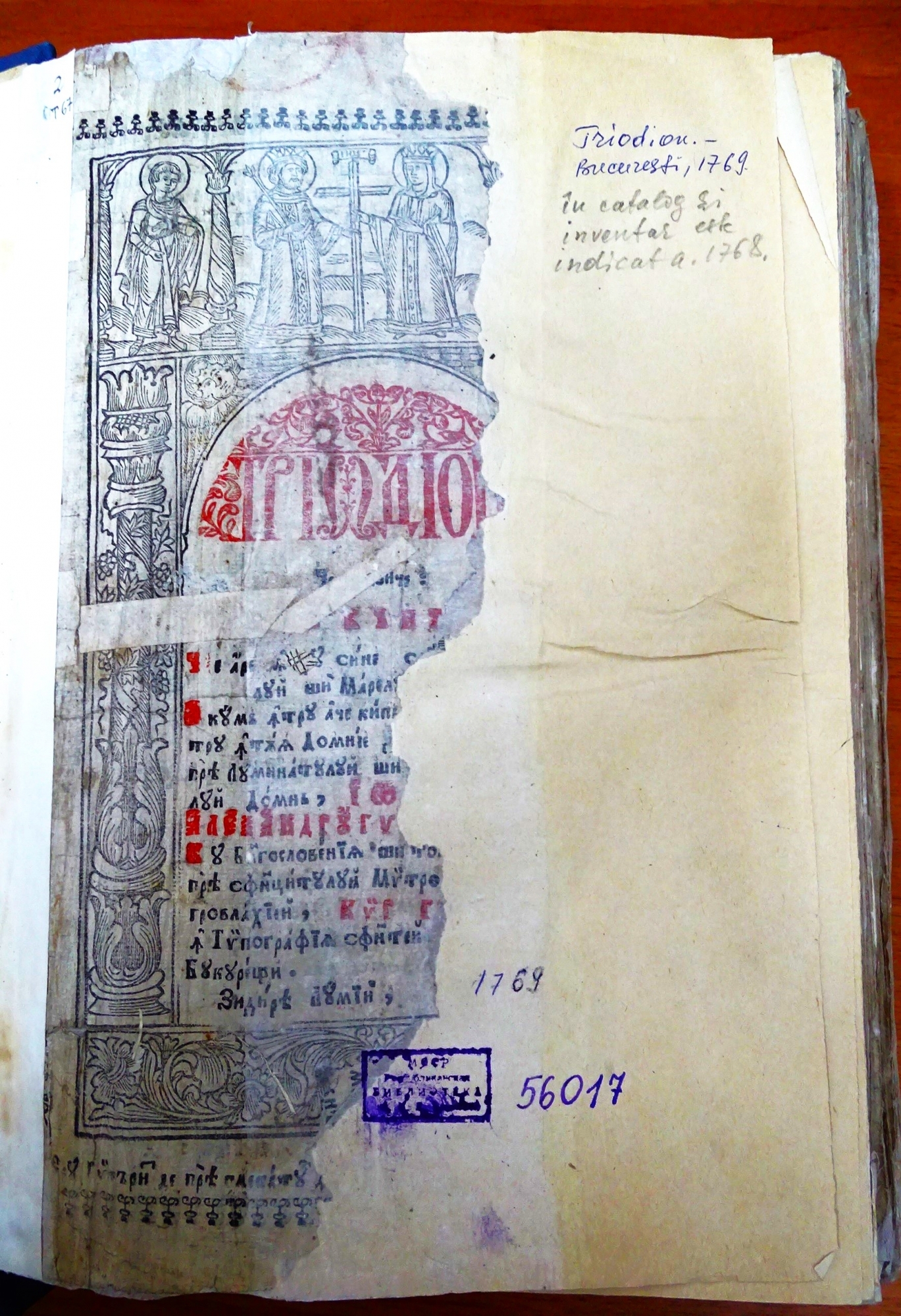 Triodion, ce să zice trei cântări, ce are întru sine slujba sfântului şi marelui post. Acum intru acest chip tipărit întru întâia domnie de Ungrovlahia a prea luminatului şi prea înălțatului domn Io Grigorie Alexandru Ghica Voievod. Cu blagoslovenia şi toată chieltuiala prea sfințitului Mitropolit al Ungrovlahiei chir Grigorie. In tipografia sfintei Mitropolii în Bucureşti. La anii de la zidirea lumii 7277 <1769>. S-au tipărit de prea plecatul între ieromonahi Grigorie ieromonah tip(ograful).