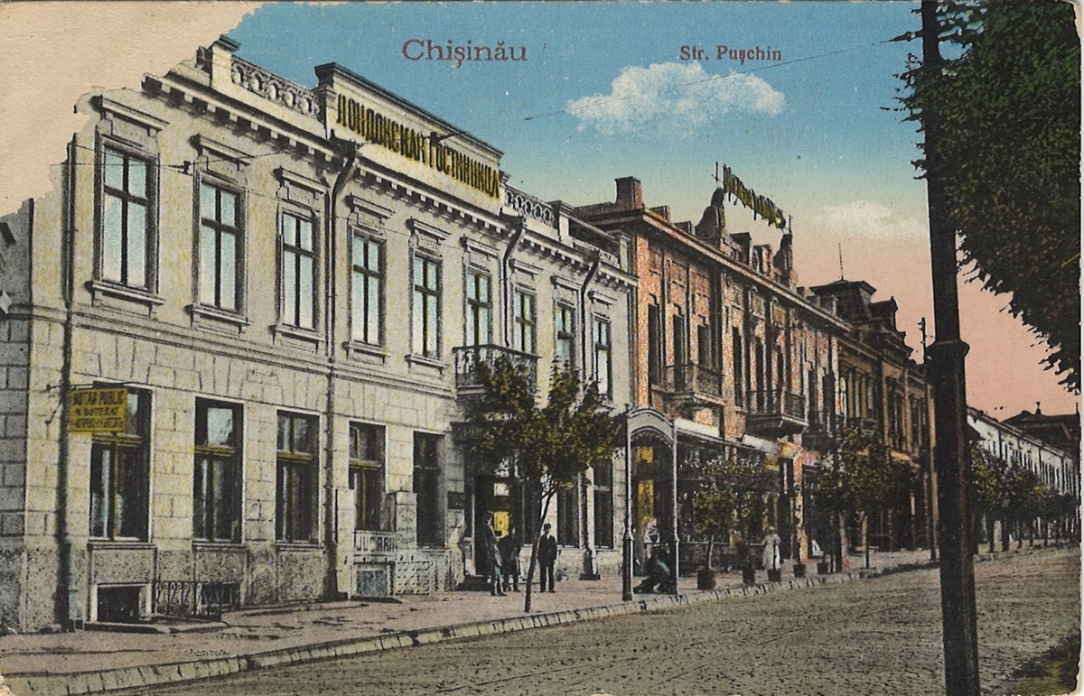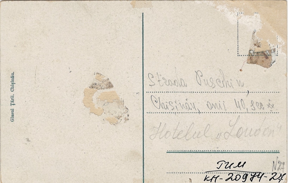 Față: Vedere exterioară din unghiul stâng al hotelului Londra, amplasat la intersecția str. Pușkin și Gostinnaia. Și-a început activitatea la sfârșitul anilor ’80 ai sec. XIX în casa proprietarului Gherș Șilkrot. Reprezintă o clădire cu două nivele, camerele de la etaj cu balcon în stil francez. Deși la parter reclamele publicitare sunt în limba română, firma hotelului, amplasată în partea superioară a edificiului, este în limba rusă. Clădirea nu s-a păstrat, a fost distrusă în anii ’40 ai sec. XX. În acel loc a fost construit un bloc cu trei nivele din piatra hotelului demolat.