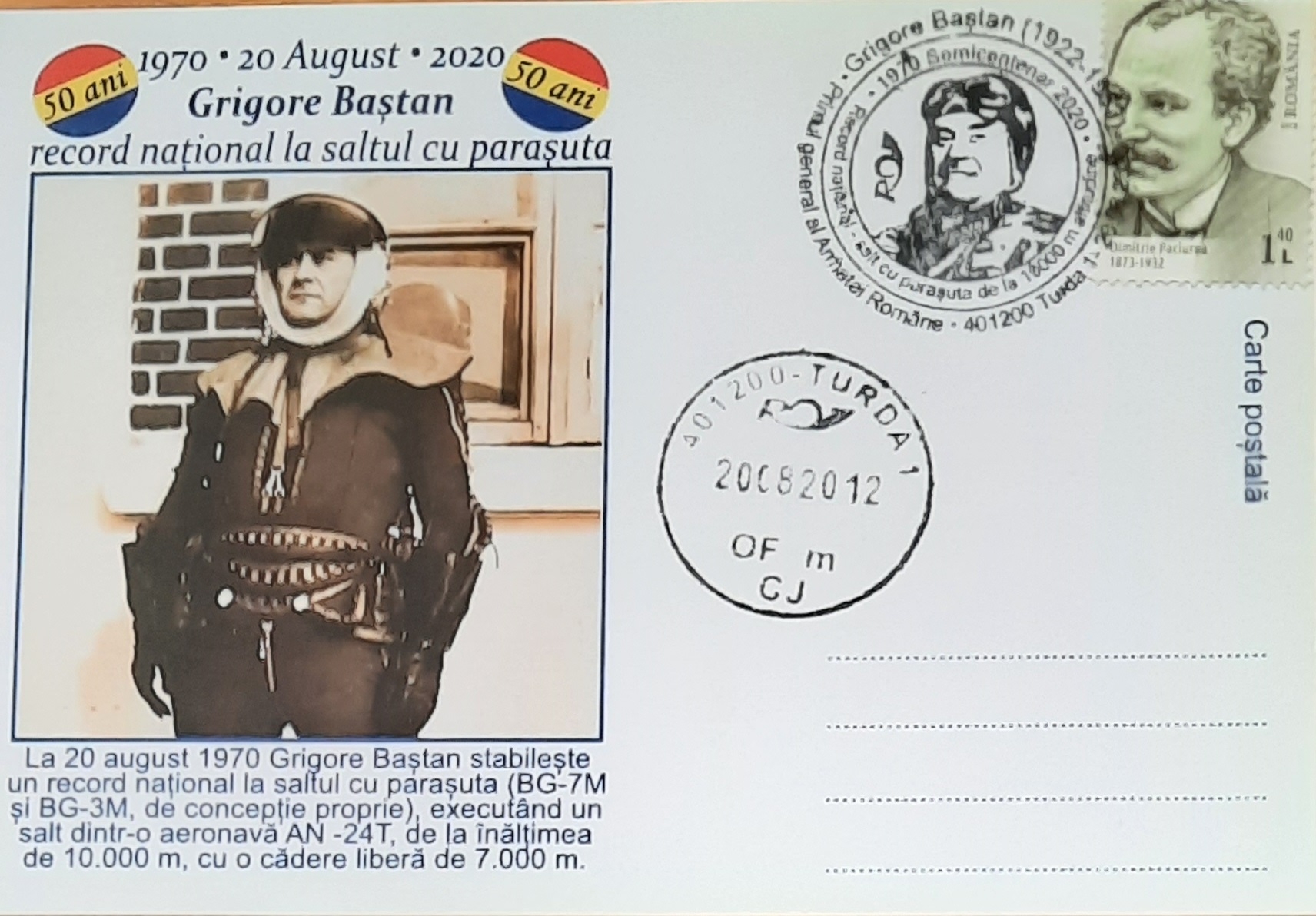 În stânga ,în partea superioară inscripțiile 1970 *20 august*2020 Grigore Baștan record național la saltul cu parașuta Din ambele părți câte un cerc tricolor cu inscripția 50 de ani Mai jos imaginea în profil, plan trei sferturi a generalului în echipament de parașutiști. Sub portret inscripția: „La 20 august 1970 Grigore Baștan stabilește un record național la saltul cu parașuta(BG-7M și BG-3M, de concepție proprie), executând un salt dintr-o aeronavă AN-24T, de la înălțimea de 10000m cu o cădere liberă de 7000m.” În dreapta superioară e aplicat un timbru cu chipul sculptorului Dimitrie Paciura. Alături simbolic e reprezentată o ștampilă cu imaginea generalului în centru și inscripții despre eveniment, mai jos aplicată ștampilă prima zi, Turda, Poşta României. Câteva linii marchează locul unde se indică adresa și destinatarul