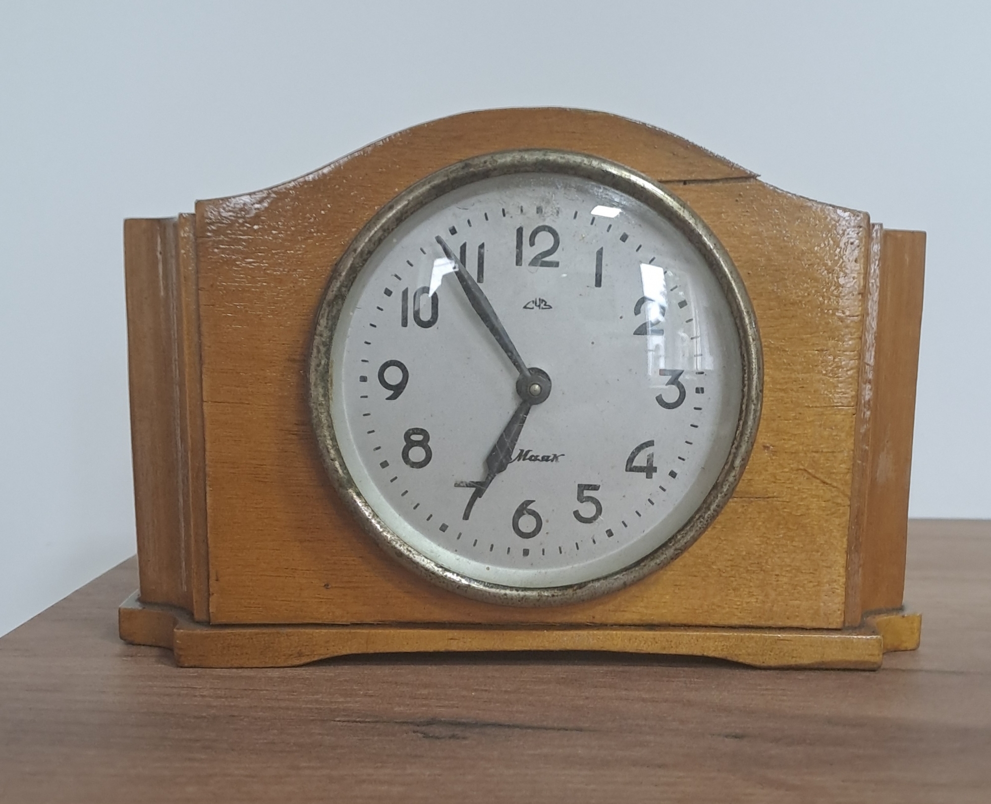 Ceas de masă corp din lemn de culoare oranj , cu cadran de culoare albă, rotund. Cifre mari de culoare neagră . Ceas mecanic, nefuncțional. Produs în Rusia, cu inscripția pe cadran ,, Маяк ''.