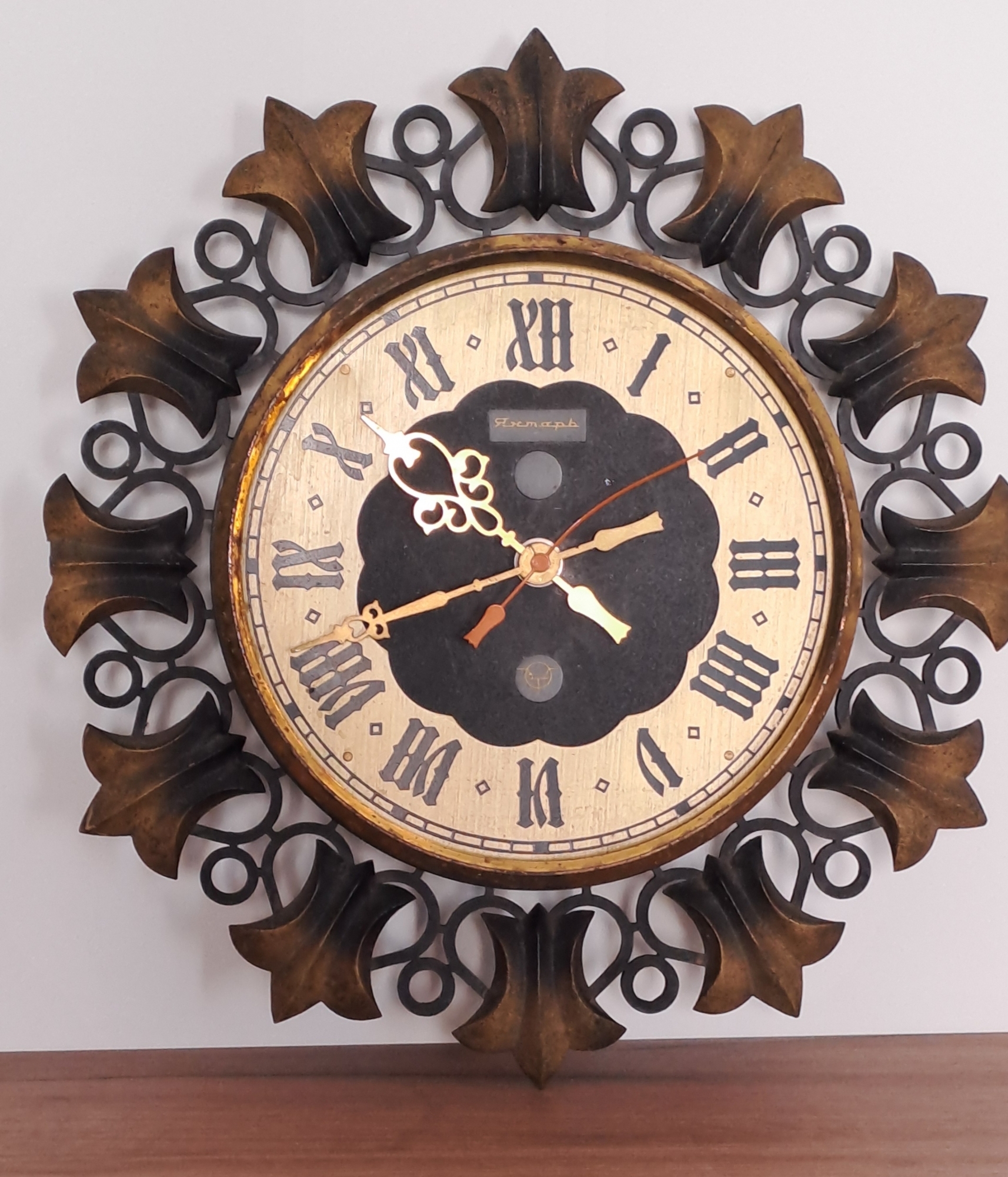 Ceas de perete în formă de floare, cu cadran rotund de culoare albă, în mijloc un cerc de culoare cafenie. Cifre mari romane de culoare neagră. Pe margine decorat cu o coroană cu ornament floral . Ceas cu baterii, nefuncțional. Produs în Rusia, cu inscripția pe cadran ,, Янтарь ''.