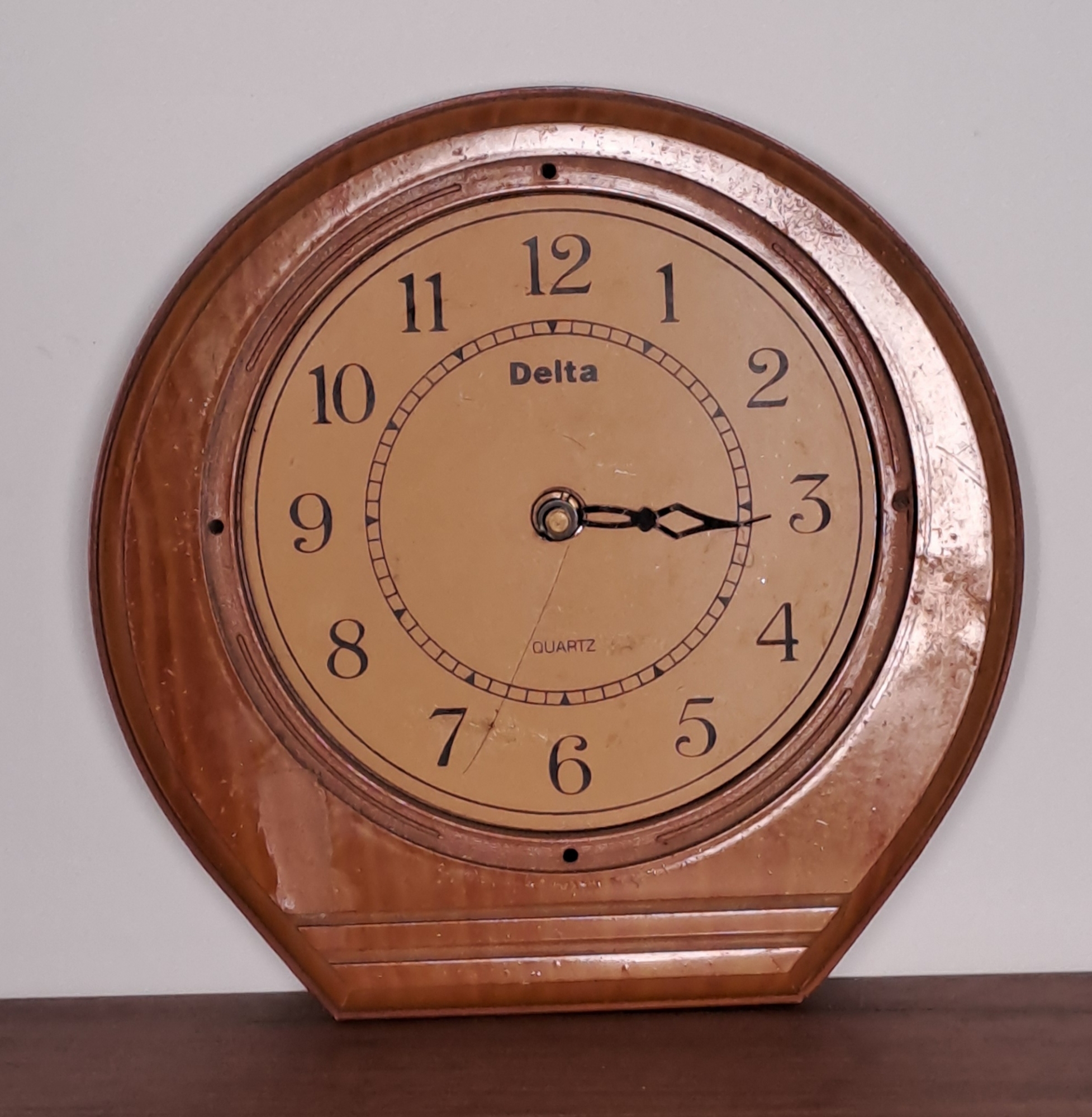 Ceas de perete cu cadran rotund ,de culoare mov. Cifre mari de culoare neagră. Este amplasat în corp rotund din plastic de culoare cafenie . Ceas cu baterii, nefuncțional. Produs în China, cu inscripția pe cadran ,, Delta QARTS ''.