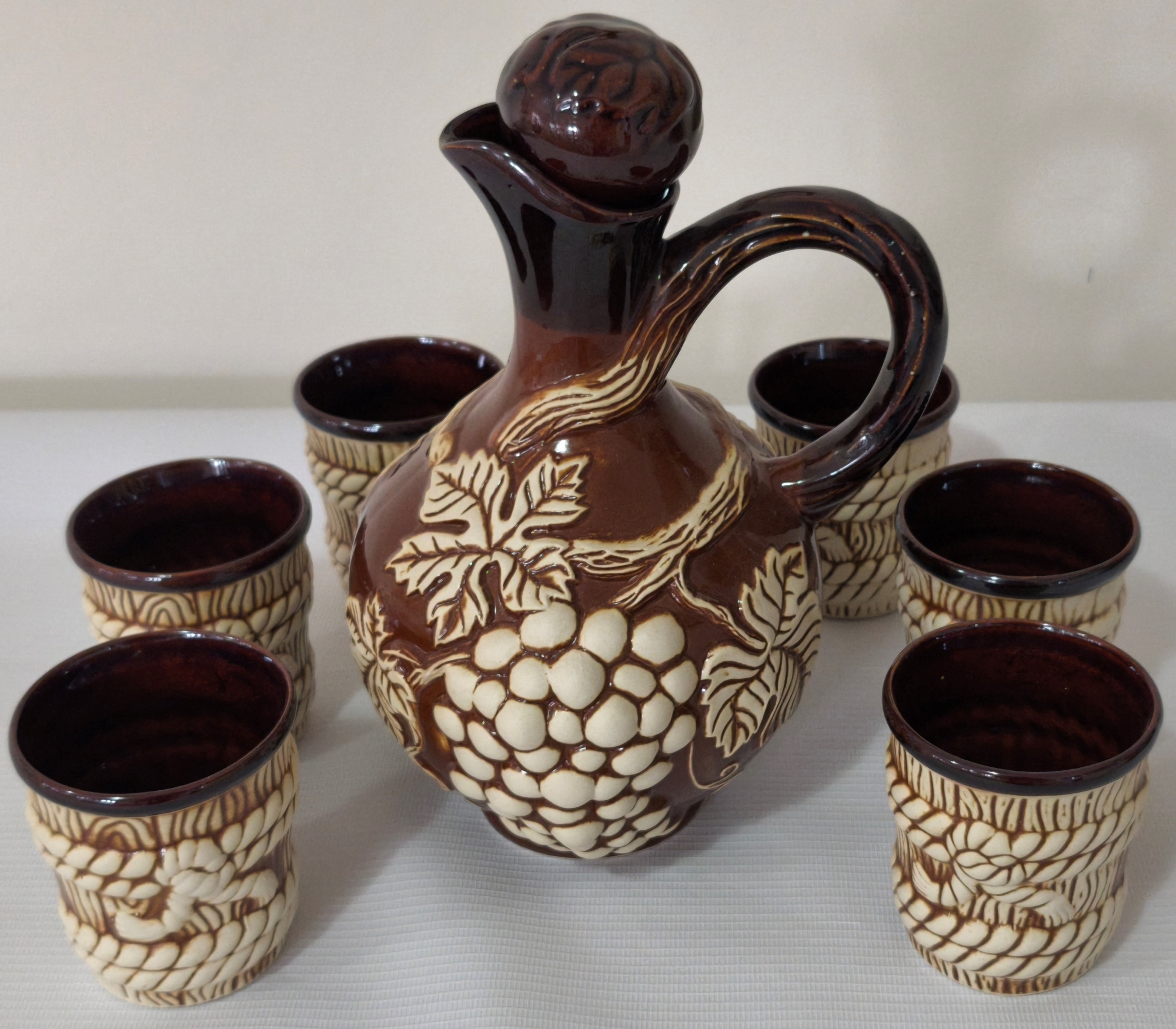 Set tradițional pentru vin din ceramică glazurată, reprezentat prin ulcior și șase pahare. Ulcior are o formă bombată, prevăzută cu um mâner curbat și un dop asortat, fiind decorat cu un model în relief ce reprezintă un strugure alb mare și frunze de vița-de-vie. Setul este completat cu 6 pahare, aceste sunt decorate cu un model ce imită textura unei frângii impletite. Setul acoperit cu glazura cu nuanțe brun și crem.