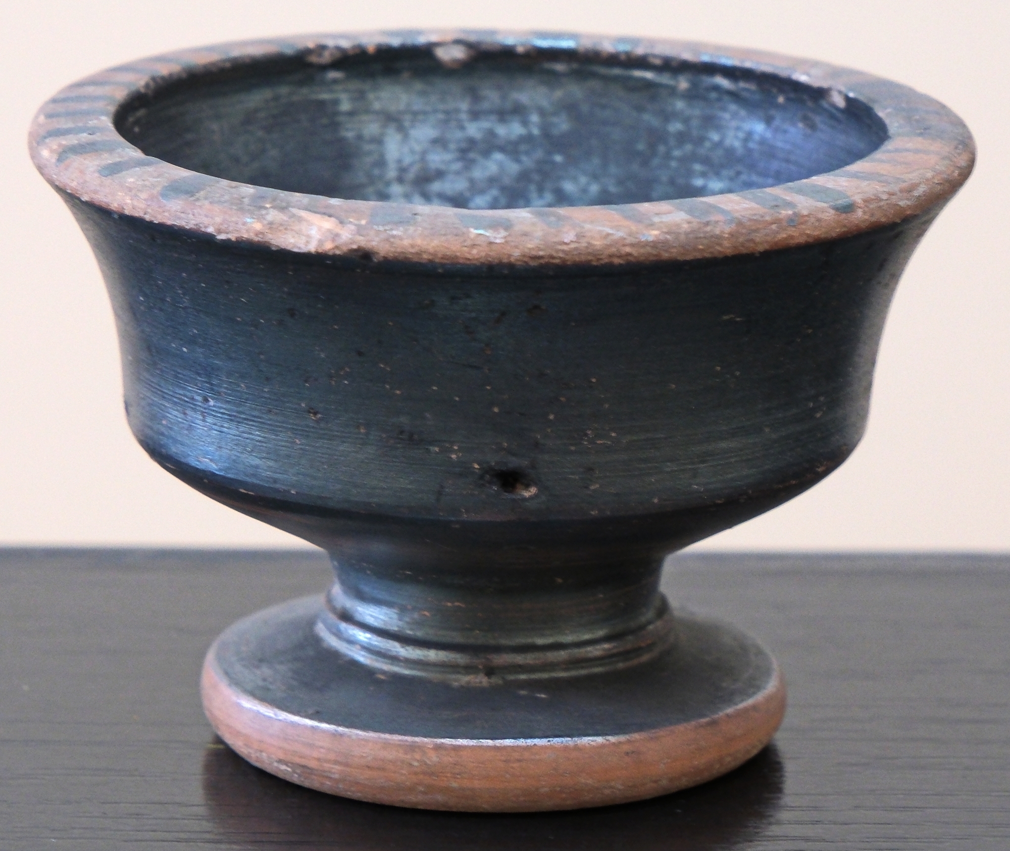 Vas antic, de forma unei ceșcuțe, cu picior scund și talpă circulară. Suprafața vasului acoperită în întregime cu glazură neagră, prezintă superior și inferior două cîmpuri lăsate libere, unde pe marginea gurii se înscriu linii cu aspect repetitiv. Cromatica: cărămiziu (fond), negru (decor).