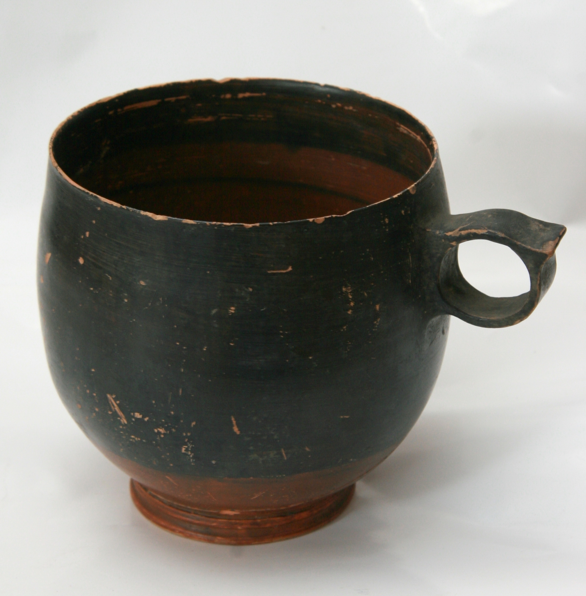 Vas antic, în formă de cupă adînca și largă, prevăzut cu un mîner în formă de buclă, și o bază circulară. Fața externă a vasului este acoperită aproape în întregime cu glazură neagră și doar partea inferioară este lăsată liberă. Decorul intern este constituit din linii și benzi. Cromatica: cărămiziu (fond), negru (decor).