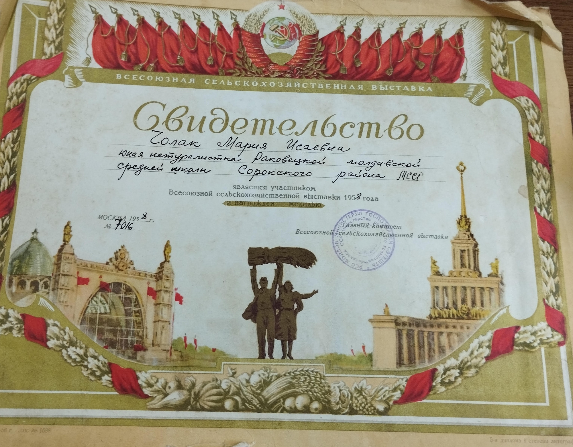 Adeverință nr.7016 care atestă participarea lui Ciolac Maria Isaevna, o tânără naturalistă din raionul Soroca, expoziție.