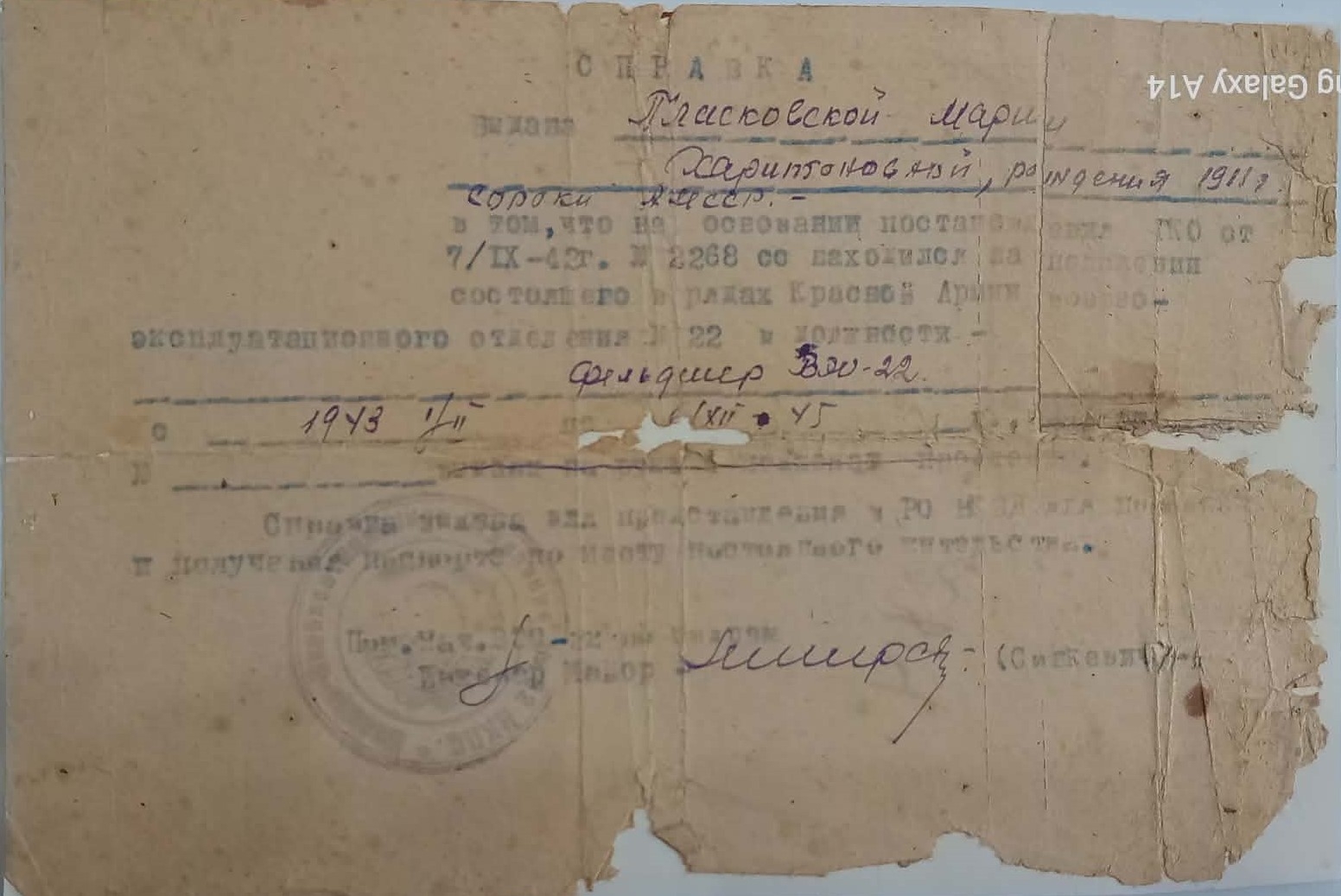 Certificatul eliberat lui Plaskovskaia Maria Hariton, născută în anul 1911,locuitoare a orașului soroca se confirmă că în baza hotărîrii IKO Nr.2268 din 07.09-1942 a făcut parte din răndurile Armatei Roșii în cadrul Secției de Exploatare Nr.22 ocupând funcția de Feldcer VOV-22.a ocupat această funcție din 1943 până în 1945.
