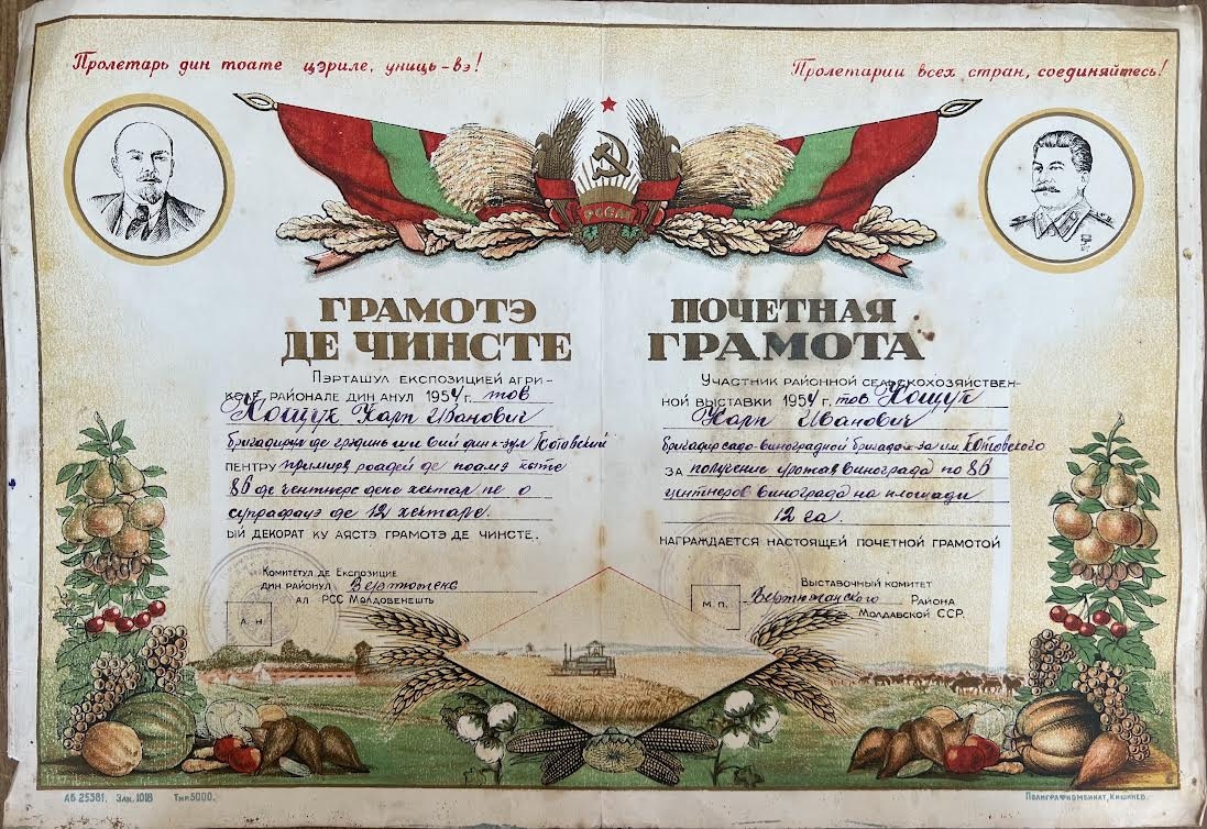 Diplomă de onoare (Gramotă de cinste) decernată lui Coșciug Carp Ivan, ”părtașul expoziției Agricole Raionale din 1954, brigadirul de grădini și din colhozul ”Котовский” pentru primirea roadei de poamă câte 86 de centnere de pe hectar pe o suprafață de 12 hectare”.