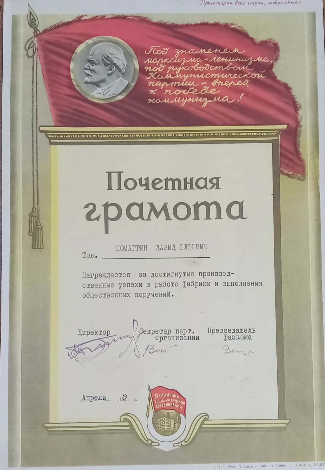 Diplomă de Onoare a lui Pomagrin din aprilie pentru succesele în lucru de producție la fabrică.