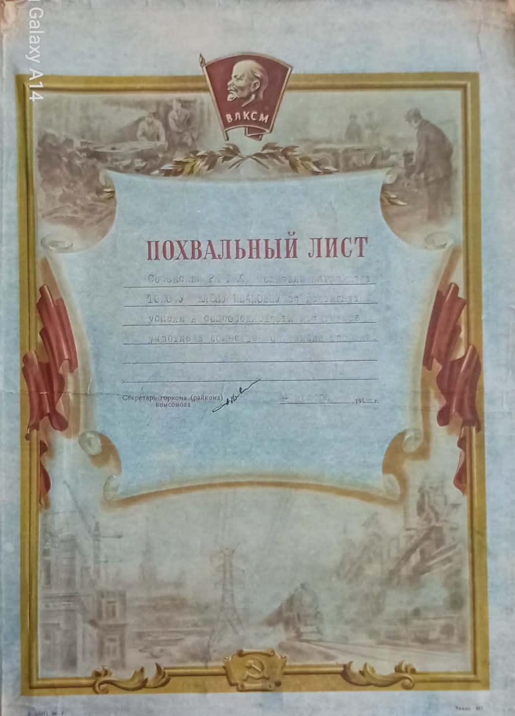 Diploma de onoare a 45 ani lui Tonofa Elena pentru succese în competiția socialistă și participare activă la viața publică a fabricii nr.4, Soroca
