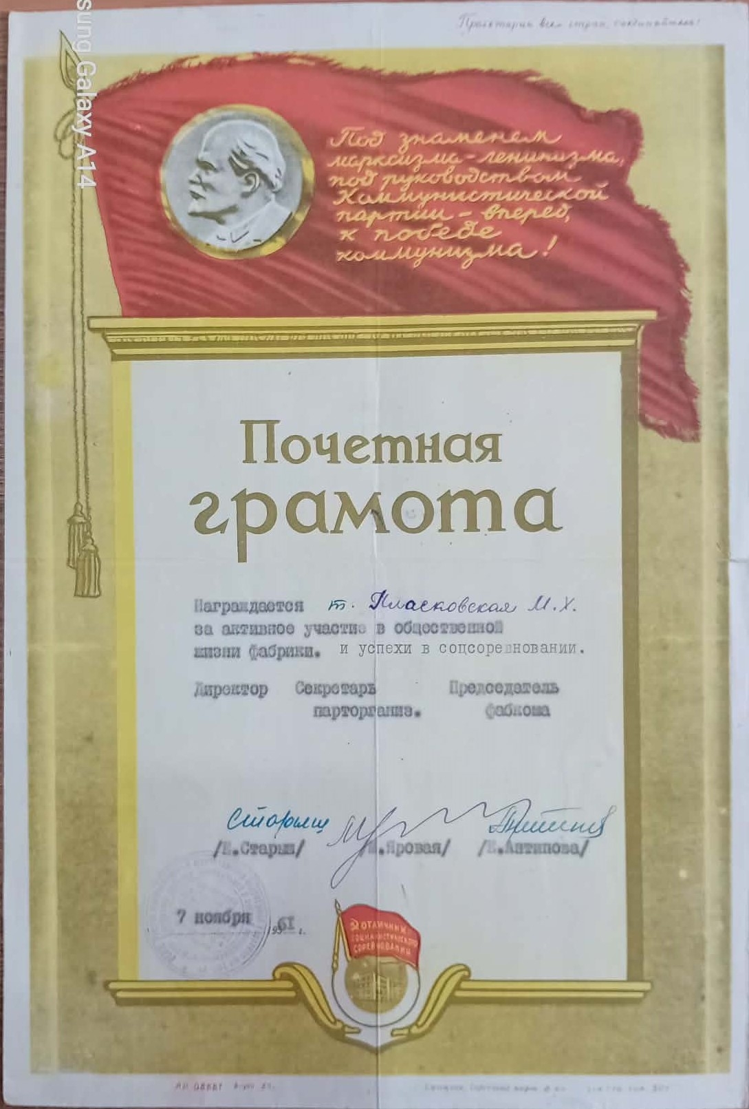 Plaskovskaia Maria Hariton penru participare activă la viața socială a fabricii și succes obținut în competiția socialistă.