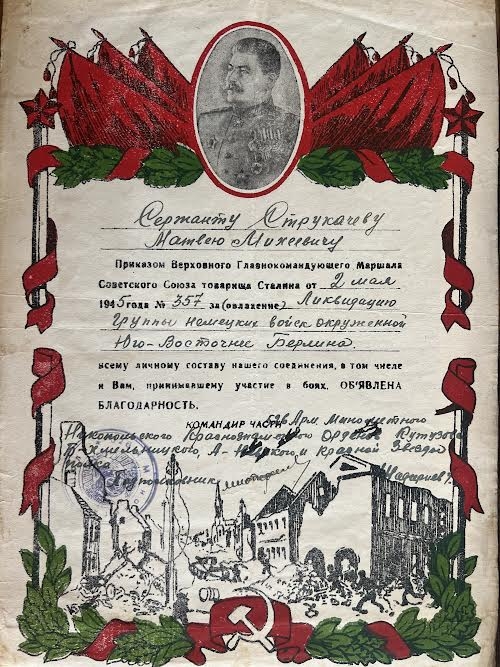 Diploma sergentului Strucaciov Matei Mihai, dercernat prin ordinul Comandantului Suprem al Uniunii Sovietice, Mareșalul Tovarășului Stalin, din 2 mai 1945, nr. 357, pentru lichidarea grupului de trupe germane încercuite în sud-estul Berlinului