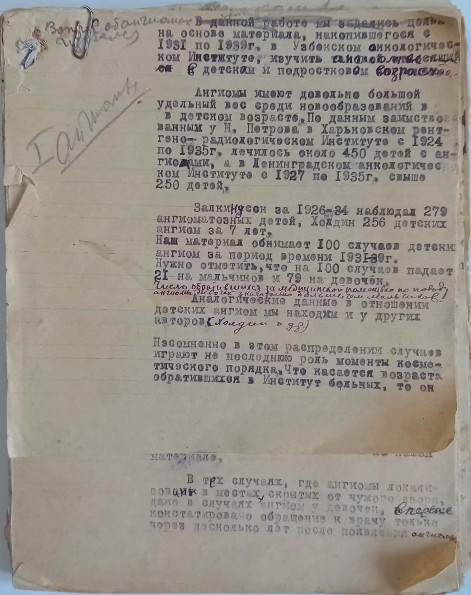 Lucrarea a fost realizată la Institutul de Oncologie din Uzbechistan( Tașkent) de Subbotin Simion F. Pe baza materialelor acumulate între anii 1931 și 1939.Subiectul cercetării este :,,Angioamele”(hemangioamele) ce sunt tumori vasculare benigne,foarte frecvente în rândul nou-născuților și copiilor.Textul descrie statistici din diverse centre medicale sovietice pentru evidența și amploarea problemei:Haricov (1924-1935)- Aproximativ 450 de copii tratați la Institutul de Rento-Radio-Oncologie.