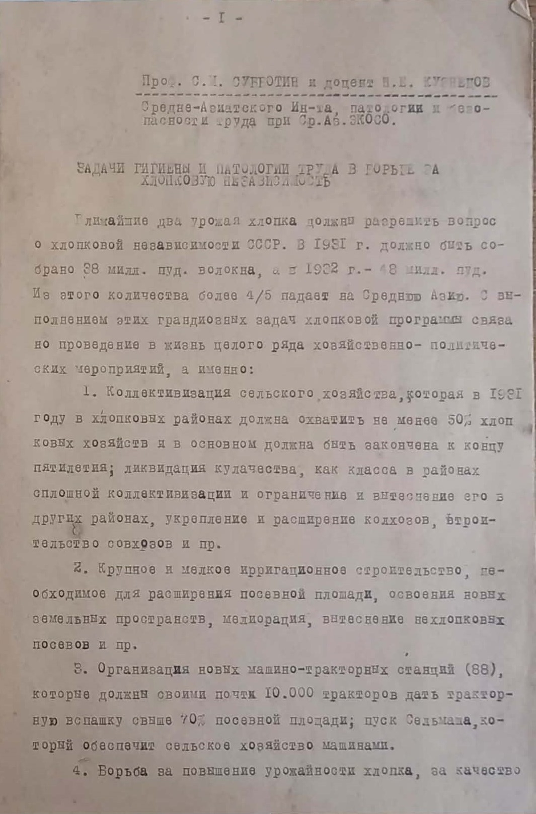 ,,Sarcinile igienei și patologiei muncii în lupta pentru independența bumbacului”.Revista reflectă prioritățile ideologice și economice a Uniunii Sovietice,Bisinoz este una dintre în perioada de industrializare forțată a agriculturii.termenul de ,,Independență a Bumbacului ” se referă la efortul statului sovietic de a elimina importurile de materie primă textilă din Occident.Bumbacul era considerat o ;;Resursă Strategică ” esențială atât pentru industria ușoară,cât și pentru cea militară.Cercetările de igienă a muncii prezentate în revistă analizau condițiile dificile din marile plantații de bumbac din Asia Centrală.Oamenii de știință studiau efectele expunerii prelungite la temperaturi extreme și la soare în timpul recoltării.Un subiect central al acestor studii era patologia muncii,concentrându-se pe bolile respiratorii cauzate de praful de bumbac.Bisinoza este una dintre afecțiunile pulmonare specifice indentificate în rândul muncitorilor din acest sector.