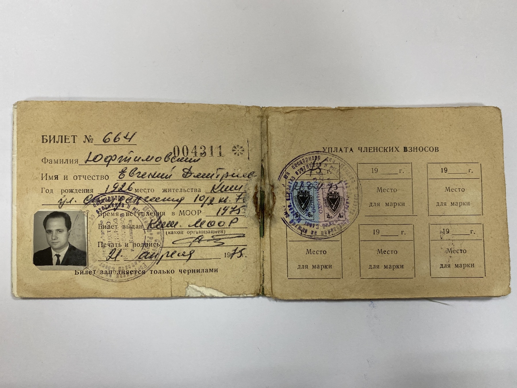 Se prezintă sub forma unui căiețel cu 4 pagini. Pe coperta verde în partea superioară inscripția - Societatea vânătorilor și pescarilor din RSSM, pe centru- Carnet, iar în partea inferioară Pescar amator. La deschidere pe stânga - sus inscripția Carnet nr. 664, serie 004311. Urmează fotografia (portret –cap, în profil) cu textul imprimat tipografic și intercalat cu scrisul manual în limba rusă prin care se confirmă că Iuhtimovschi Evghenii este membrul Societății, Secția Chișinău. Ștampila, data și o semnătură confirmă valabilitatea carnetului. Pe dreapta - informații despre achitarea cotezațiilor de membru, justificate prin ștampilă, timbre de cotizație și semnătură. Pe ultimile pagini cu text imprimat tipografic -drepturile și obligațiile pescarului.