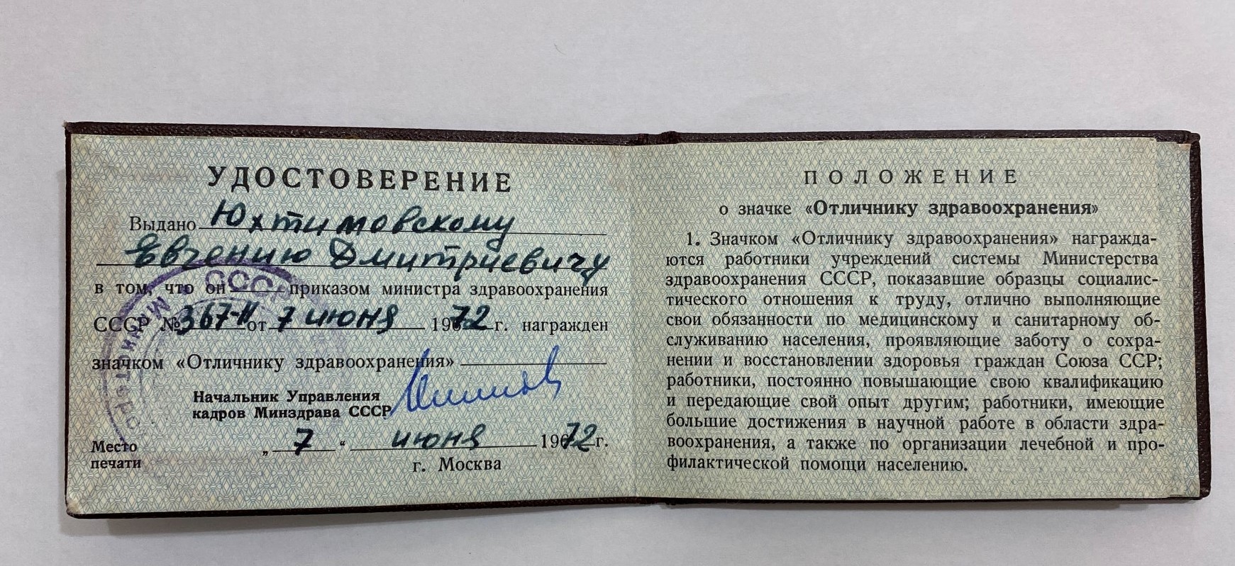 Se prezintă sub forma unei căiețel cu 4 pagini. Pe coperta maro în colțul stâng imaginea reliefată a insignei „Eminentului ocrotirii sănătății” alătri inscripția cu auriu URSS. În partea de jos inscripția Ministerul Ocrotirii Sănătății al URSS. La deschidere pe stânga în partea superioară inscripția Certificat, mai jos textul imprimat tipografic și intercalat cu scrisul manual în rusă prin care se confirmă că Iuhtimovschi Evghenii este decorat cu insigna în cauză În partea de jos - ștampila Ministerului Ocrotirii Sănătății al URSS, semnătura șefului Direcției resurse umane a Ministerul și data. Pe stânga și celelalte pagini sunt imprimate tipografic extrase din Regulamentul referitor la insignă.