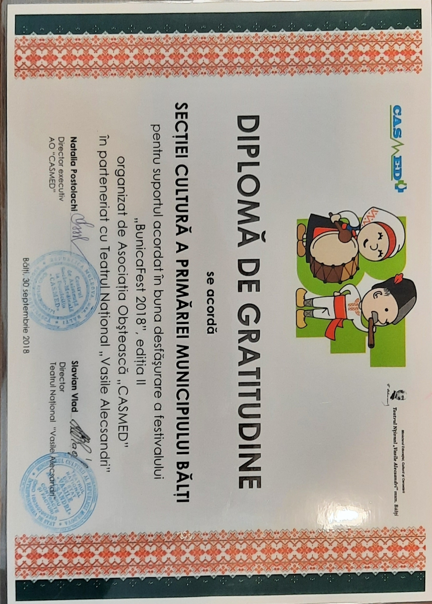Diplomă Conferită Secției Cultură a primăriei mun.Bălți pentru buna desfășurare a festivalului „BunicaFest”