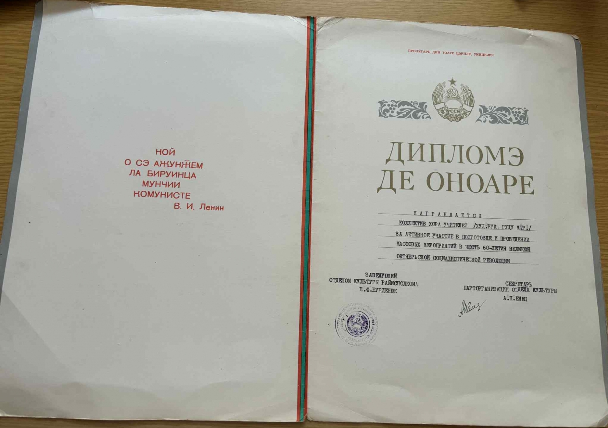 Diplomă se decernează colectivul coral profesorilor pentru participarea activă în desfășurarea evenimetelor de masă cu ocazia celor 60 de ani de la Marea Revoluție Socialistă din Octombrie. Documentul are doua file, textul este scris(dactilografiat) în interiorul acestora. Este semnătura secretarului Organizației de Partid a Secției Cultură - Emeț A.P și ștampila șefului secției cultură - Burdeniuc V.F.