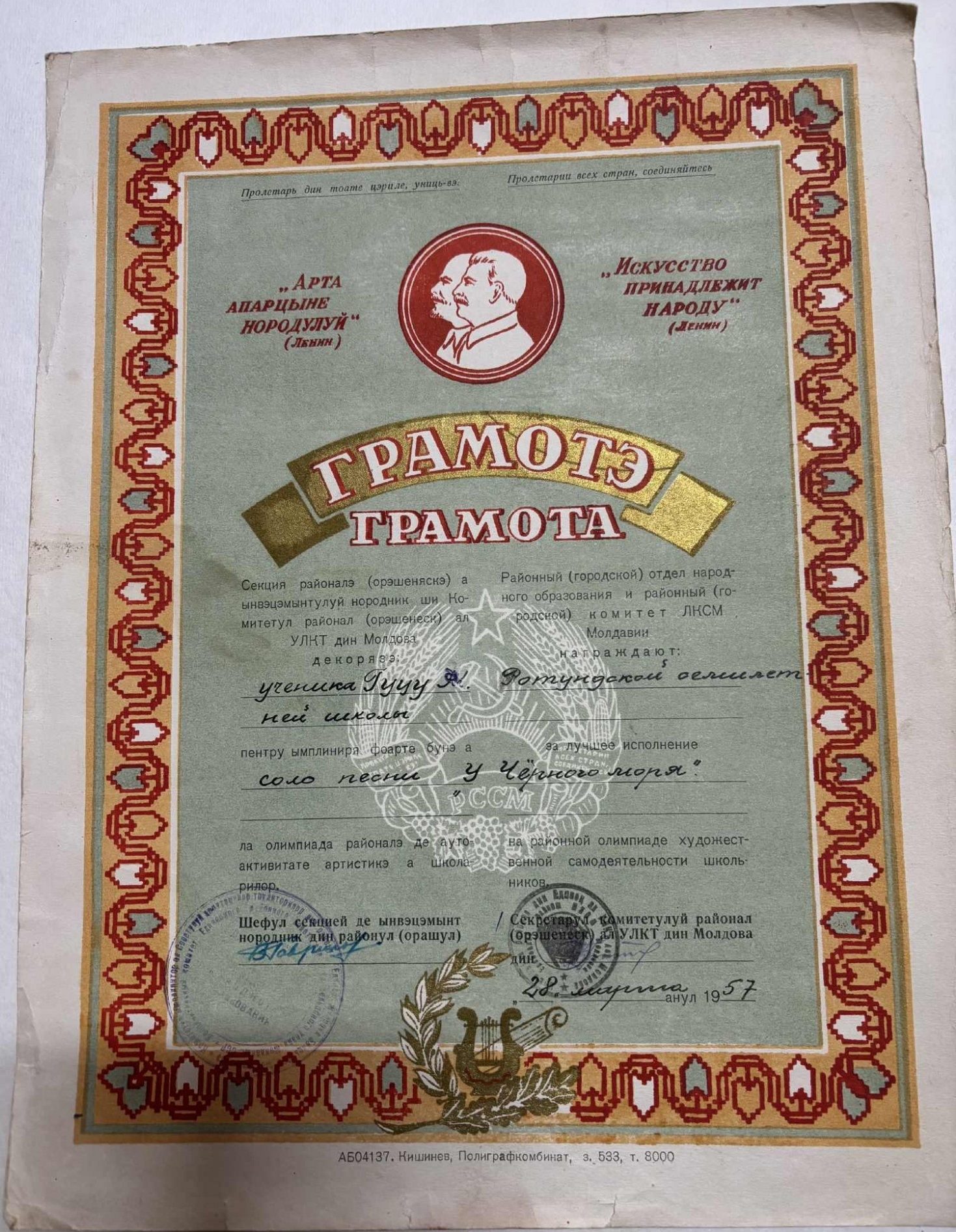 Diplomă a elevului Guțu Mircea, a școlii de șapte ani din satul Rotunda pentru interpretare foarte bună a cântecului ,, U chernogo moria'' la olimpiada raională de autoactivitate artistică a școlilor. Diploma are un chenar de ornamente geometrizate, în partea de sus chipul lui Lenin V.I și Stalin I.V înt-un cerc roșu. În stânga sus e scris: ,, Arta aparține narodului'' (Lenin) . În partea de jos sunt 2 ștampile și 2 semnături a șefului secției de învâțămînt norodnic din raion și a secretarului comitetului raional al UZCT din Moldova - Uniunea Leninist comunistă a Tineretului.