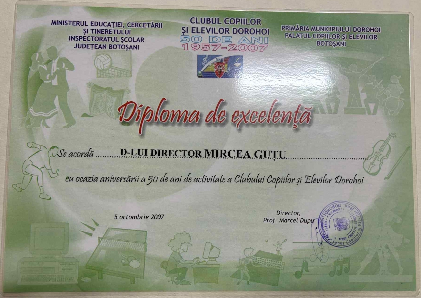 Ministerul Educației,cercetării și tineretului, Inspectorul școlar județean Botoșani. Clubul copiilor și elevilor Dorohoi. Primăria municipiului Dorohoi. Palatul copiilor și elevilor Botoșani acordă Diplomă de excelență directorului Școlii de muzică Edineț - Guțu Mircea R și elevilor Dorohoi. Documentul este imprimat pe o filă . Este semnătura Directorului Prof. Marcel Dupu și ștampila rotundă (cu cerneală violetă) a Clubului copiilor și Elevilor Dorohoi. În partea de sus centru a diplomei este emblema Clubul Copiilor și Elevilor Dorohoi; 50 ani; 1957-2007.