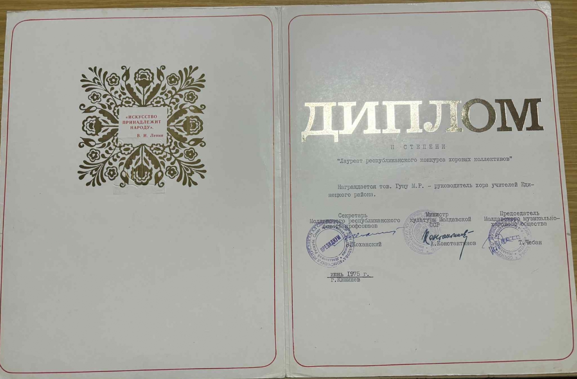 Diplomă de gradul II ,, Laureat a concursului republican a coruruilor'' prin care se confirmă decorarea - conducătorului corului profesorilor din raionul Edineț. Documentul are două file. Textul este dactilografiat în interiorul acestora. Sunt semnăturile și ștampilele rotunde ale: Secretarului Consiliului sindicatelor din RSSM - Cohanslii V.; Ministrului Culturii din RSSM - Constantinov A.; Președintele societății muzical coarale din RSSM - Ceban T. Ștampilele sunt aplicate cu cerneală de culoare violetă.