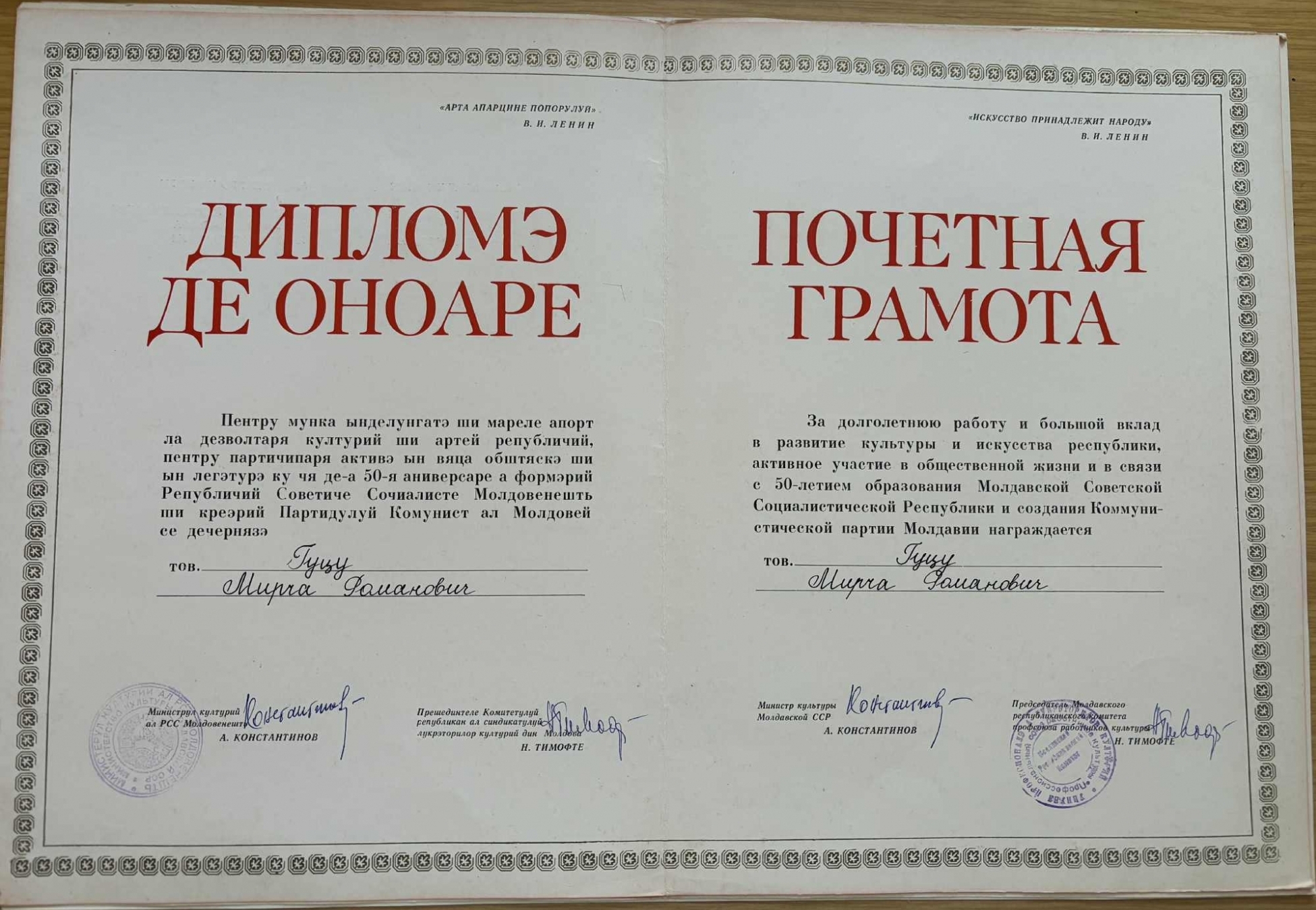 Guțu M.R este decorat cu diplomă de onoare pentru munca îndelungată și marele aport în dezvoltarea culturii și artei republicii pentru participarea activă în viața obștească și în legătură cu cea de-a 50 aniversare a formării RSSM și a Partidului Comunist din Moldova. Documentul are 4 file, textul este imprimat în interiorul filei a doua și a treia. Numele titularului este scris manual cu cerneală neagră . Are ștampilă și semnătura - Ministerului Culturii din RSSM - Constantinov A și a Președintelui Comitetului Republican al sindicatului lucrătorilor culturii din Moldova - Timofti N.