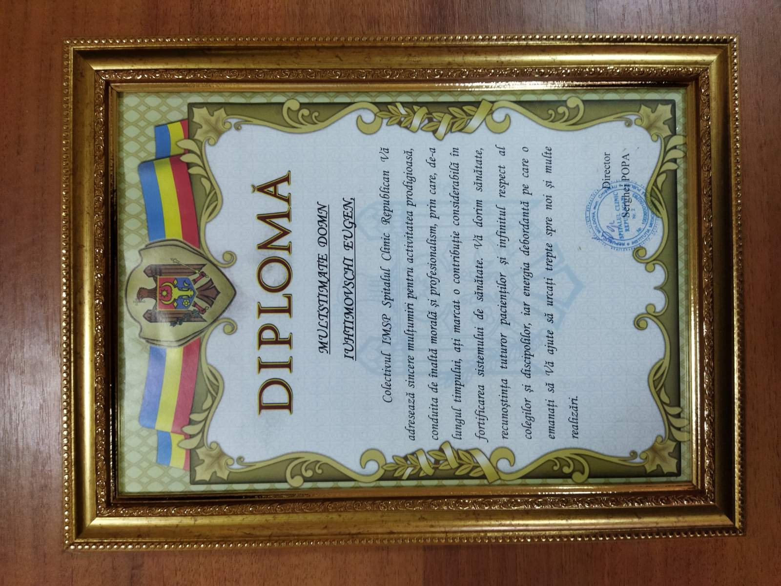Diplomă de formă dreptunghiulară. Pe un fundal galben cu ornamente stilizate geometrice -un cadru simbolic, care reprezintă ramuri și frunze de laur, în partea superioară pe o panglică tricolor-imaginea color a stemei Republicii Moldova, pe centru cu litere mari aurii –inscripția –Diplomă, urmează textul imprimat ( pe fundalul abia vizibil a stemei R.Moldova) prin care se confirmă că dlui Iuhtimovschi Eugen i se conferă diploma pentru activitate prodigioasă, conduită de înaltă morală și profesionalism. Ștampila și semnătura directorului Spitalului Clinic Republican confirmă valabilitatea diplomei. Diploma este încadrată în ramă de culoare aurie.