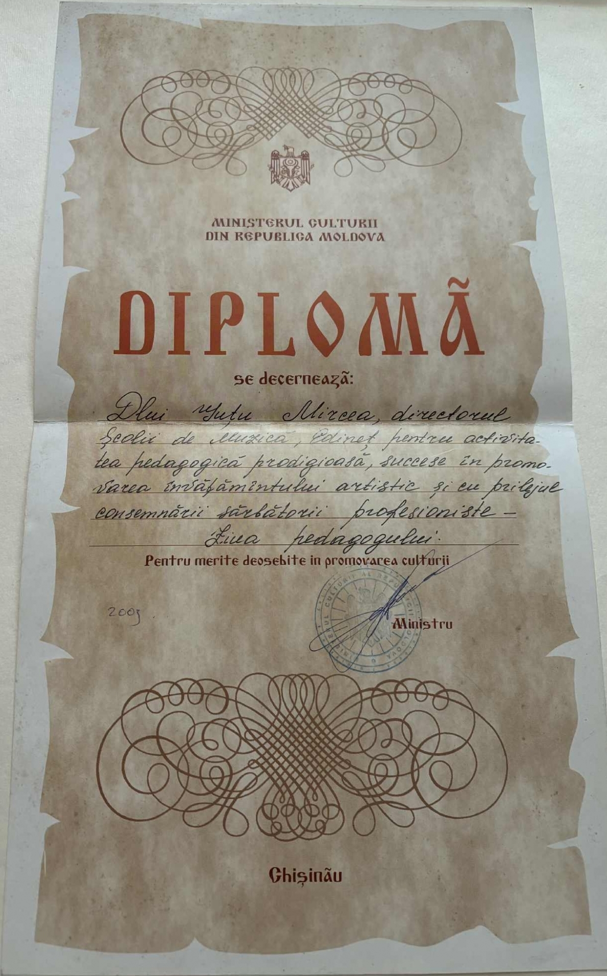 Diploma este decernată lui Guțu M.R pentru activitatea pedagogică, prodigioasă, succese în promovarea învățământului artistic și cu prilejul consemnării sărbătorilor profesionale ,, Ziua pedagogului,,. Pentru merite deosebite în promovarea culturii. Documentul este scris pe o filă. Este semnătura și ștampila Ministrului Culturii din RM.