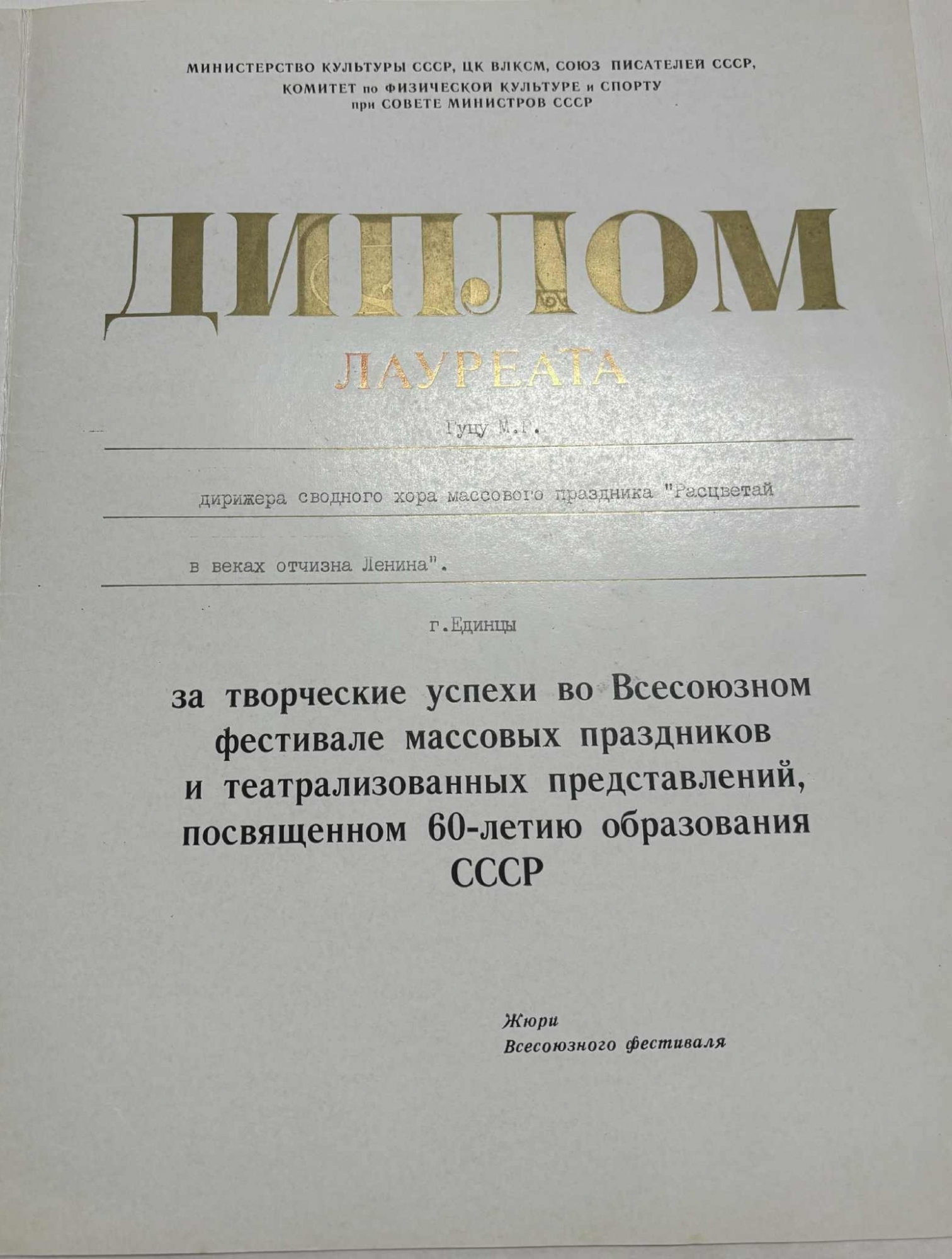 Guțu M.R - dirijor a corului combinat la sărbătoarea în masă ,, Rastsvetai v vekah ot otchizna Lenina'' ( Расветай в веках отчизна Ленин) este decorat pentru succese creative la Festivalul Unional a sărbătorilor în masă și a Prezentărilor teatrale dedicate celor 60 de ani de la formarea URSS. Documentul este scris pe două file, textul este imprimat în interiorul acestora. Pe prima filă (copertă) este steagul URSS- roșu pe care este imprimată stema URSS:Jos e scris URSS (CCCP) (SSSR) și 60 let(лет).
