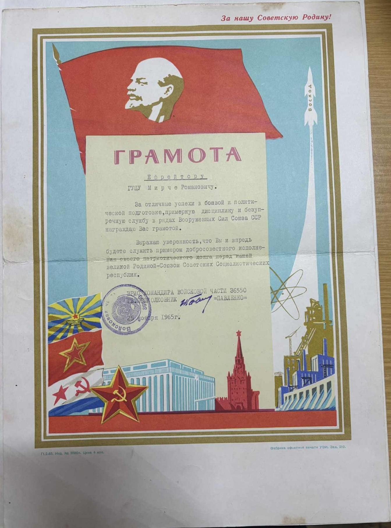 Cu diplomă se decorează caporalul lui Guțu M.R pentru succese excelente în pregătire militară și politică pentru disciplină exemplară și serviciul impecabil în rândurile forțelor armate ale URSS. Documentul este scris pe o filă; este ștampila rotundă a unității militare și semnătrura. Comandantului interimar al unității militare 36550, colonelului de gardă - Pavlenco.