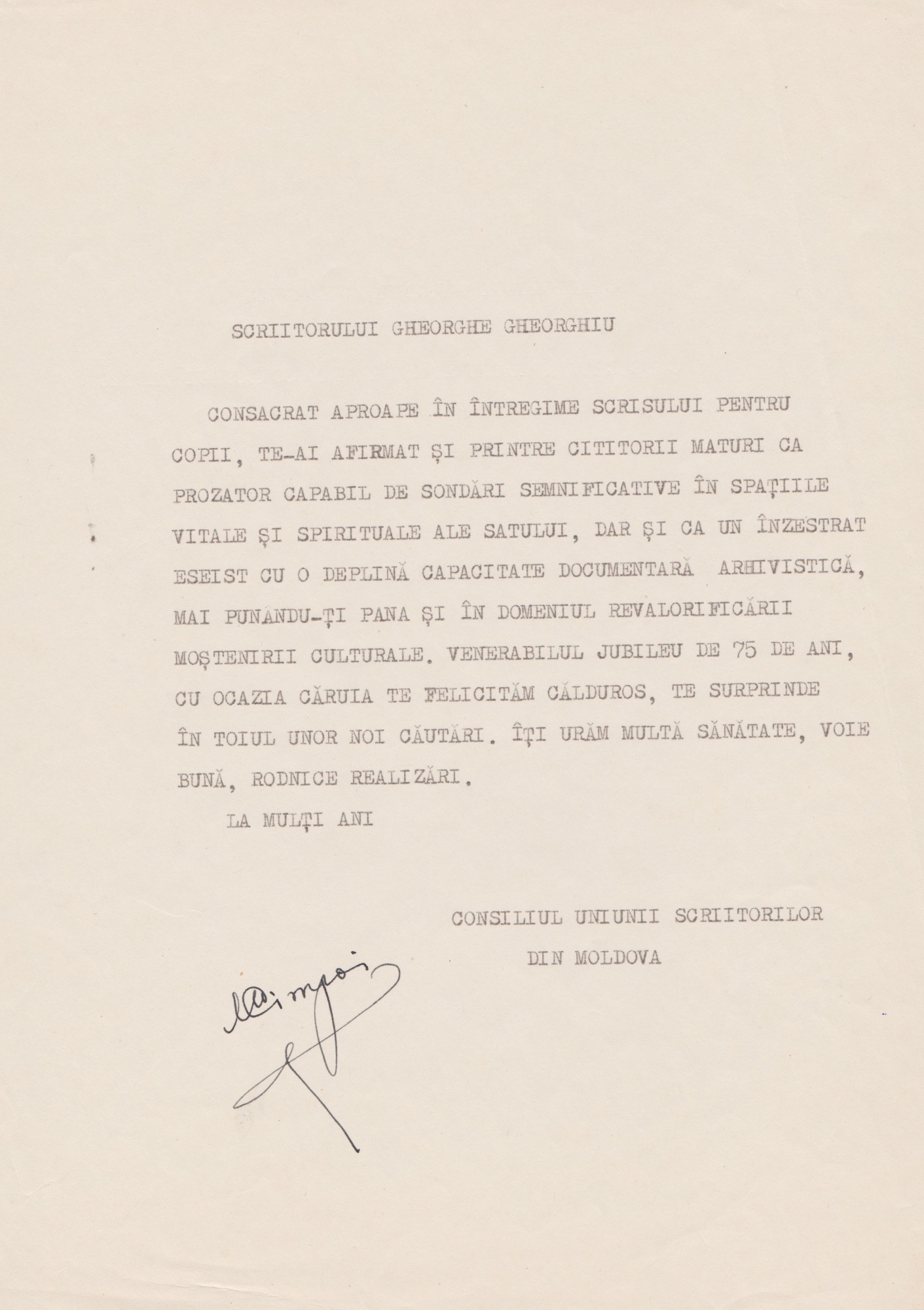 Scrisoare de felicitare dactilografiată pe foaie simplă în limba română cu grafie latină, dedicată scriitorului Gheorghe Gheorghiu, care s-a consacrat aproape în întregime scrisului pentru copii, venerabilului jubileu de 75 de ani, semnată de Consiliul Uniunii Scriitorilor din Moldova, pe partea din stânga, jos, este semnătura lui Mihai Cimpoi, scrisoare este între coperți de carton pe care este imprimată o imagine cu un stilou și călimară de culoare neagră, pe partea superioară a mapei scrie: Uniunea Scriitorilor din Moldova și pe partea inferioară este scris: Adunarea generală 1996.