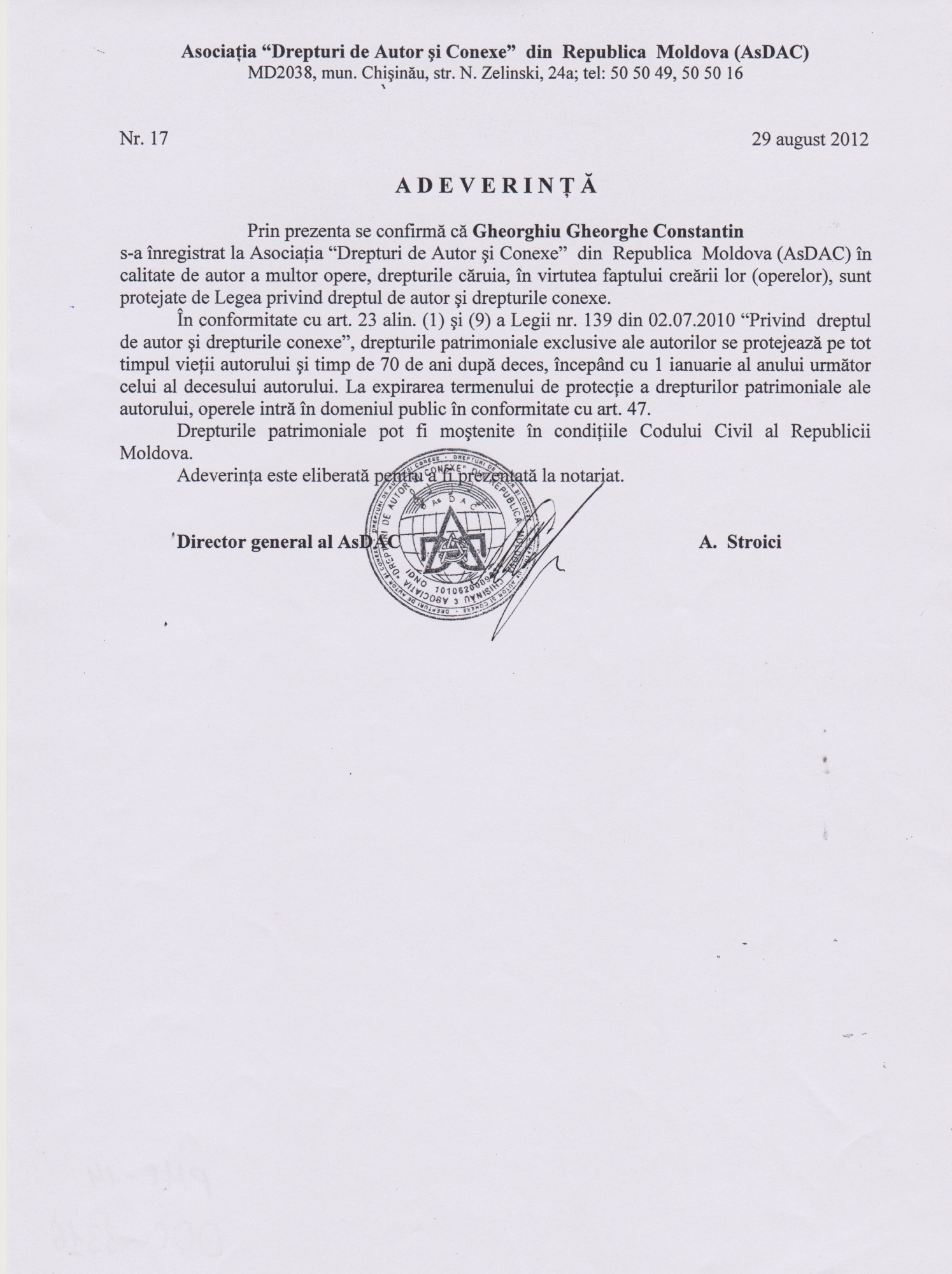 Adeverință copie a originalului prin care se confirmă că Gheorghe Gheorghiu s-a înregistrat la Asociația „Drepturi de Autor și Conexe” din Republica Moldova (AsDAC), privind drepturile patrimoniale exclusive ale autorilor se protejează pe tot timpul vieții autorului și timp de 70 de ani după deces. Adeverința cu numărul 17 din 29.08.2012. Textul documentului este o copie, tipărit pe o pagină, are o ștampilă a AsDAC, semnată de A. Stroici.