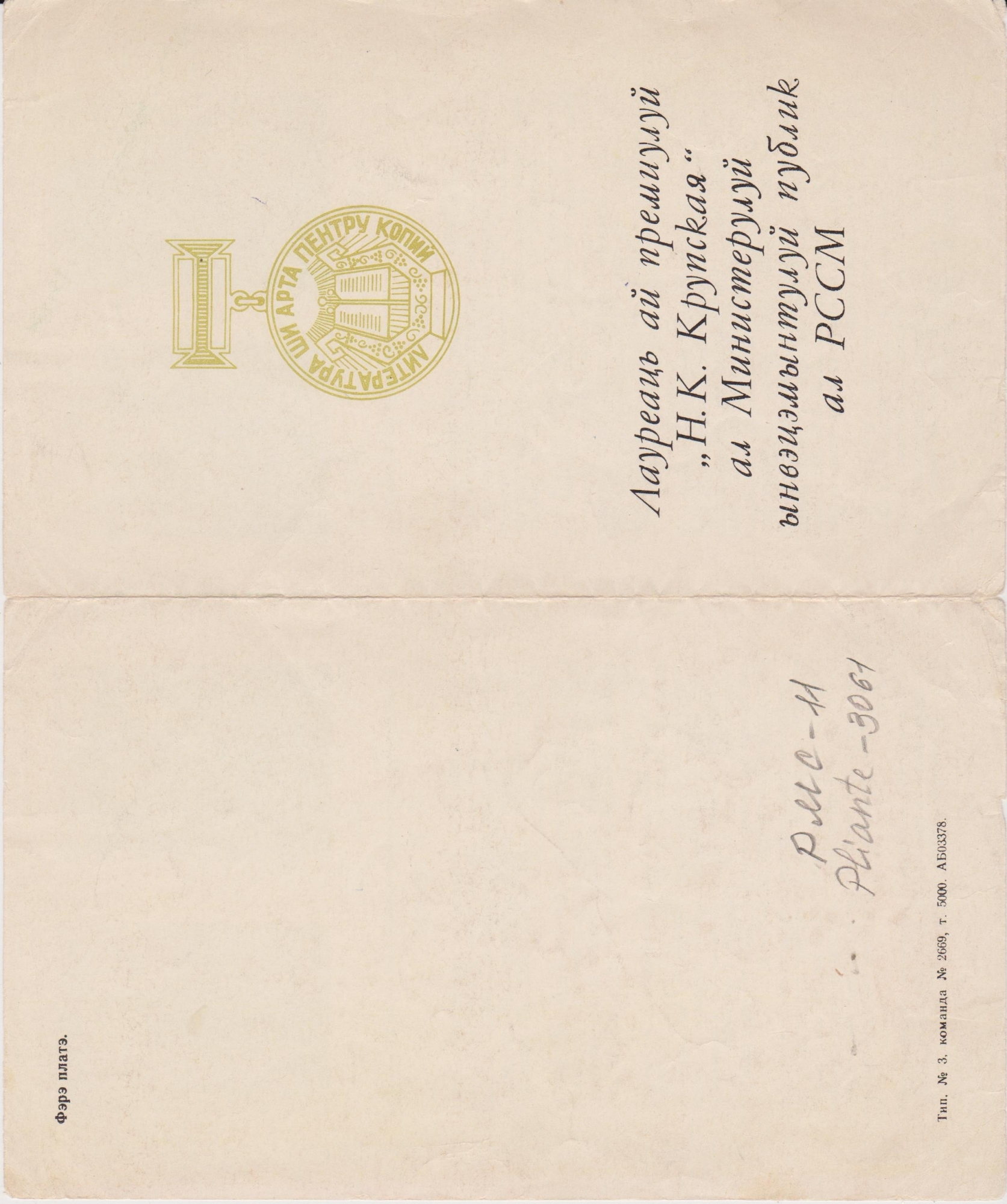 Pliantul este dedicat scriitorilor Laureați ai premiului „N.K. Krupskaia” al Ministerului Învățământului Public al RSSM: Vera Malev și Gheorghe Gheorghiu, pe pagina de titlului este logoul în forma de medalie unde este scris: Literatura și arta pentru copii. În interiorul pliantului este plasată informația despre lucrările dedicate copiilor și apare portretul alb negru al Verei Malev și coperta unei cărți, portretul scriitorului Gheorghe Gheorghiu și coperta cărții: „Căpitanii Fulgerului”, fără datare.