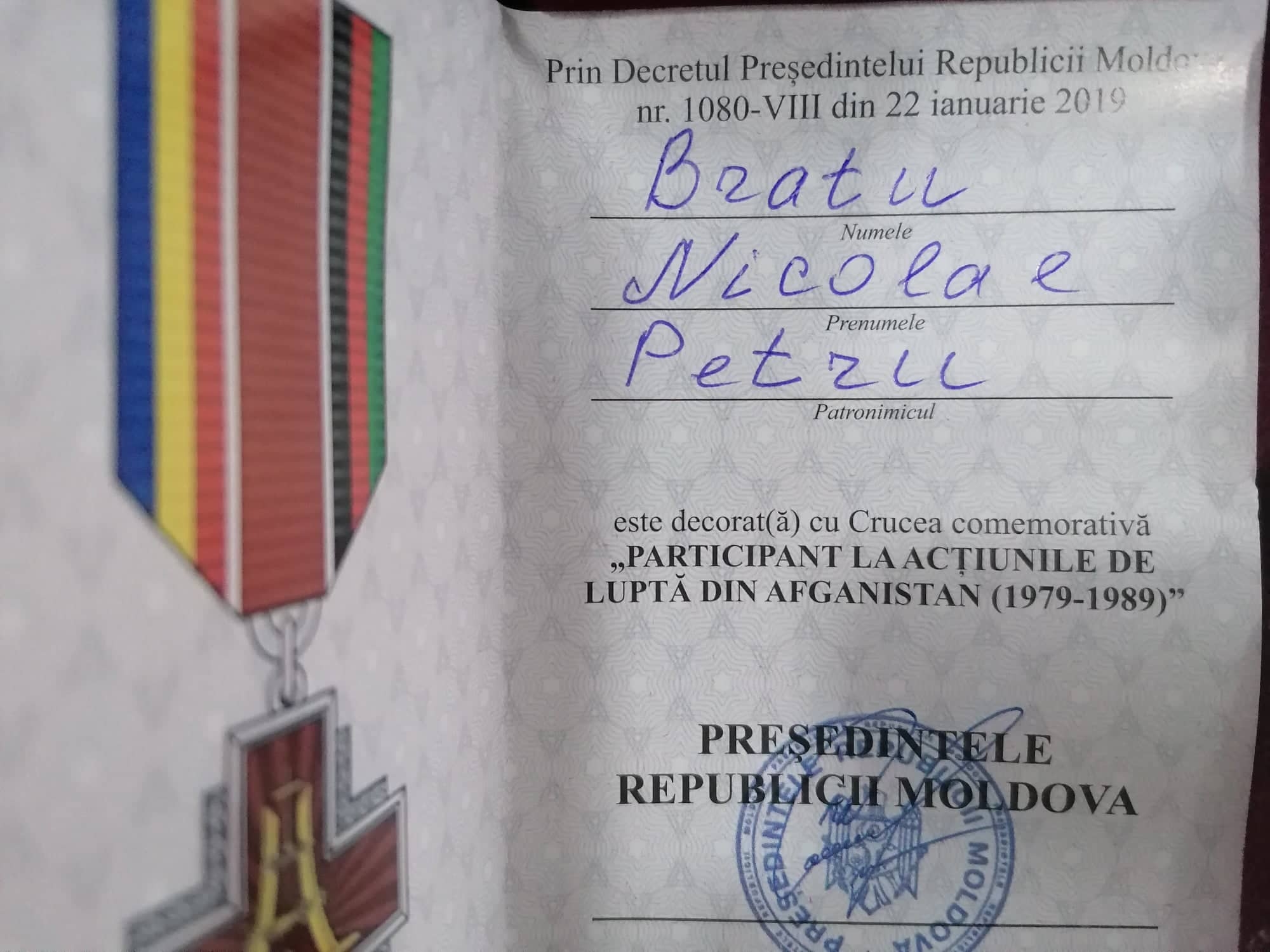 Legitimația însoțeste medalia "PARTICIPANT LA ACȚIUNILE DE LUPTĂ DIN AFGANISTAN (1979-1989)" oferită participantului de război Bratu Nicolae.