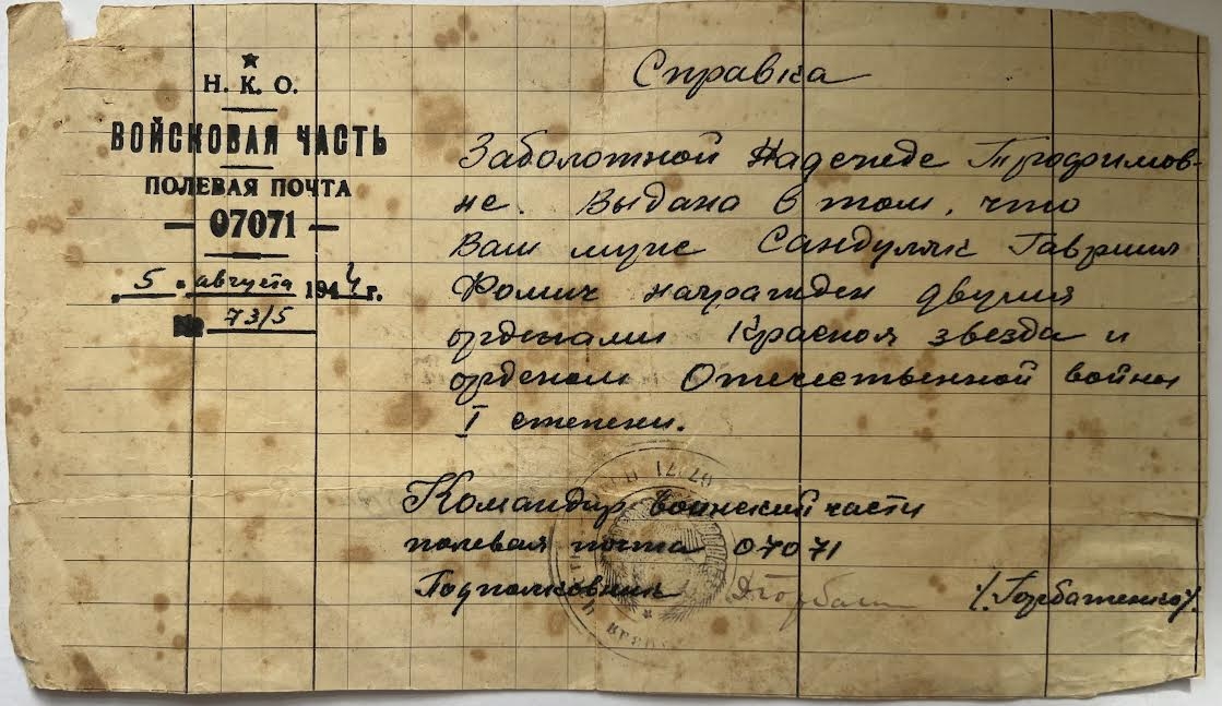 Certificat a Nadejdei Trofim Zabolotnaia. nr.7315, care certifică că soțul acesteia, Sanduleac Gavriil Foma, este decorat cu Steaua Roșie și Ordinul Marelui Război, de la comndantul unității militare post de câmp nr. 07071