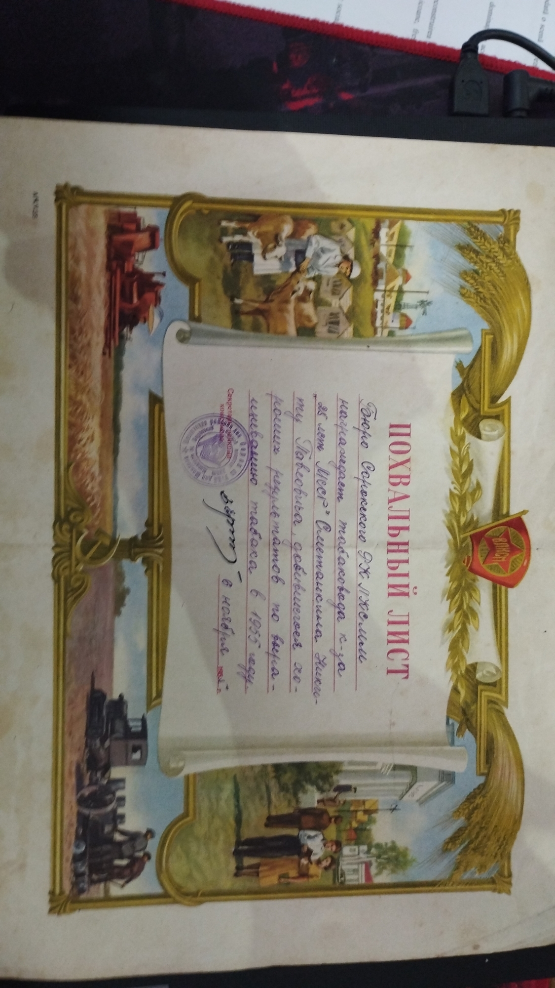 Certificat de laudă .Biroul Soroca RKLKMOM premiază cultivatorul de tutun K-za de ani de existenșă a RSSM. Nichita Pavlovici Smentanca care a obținut rezultate bune în cultivarea tutunului în 1955.