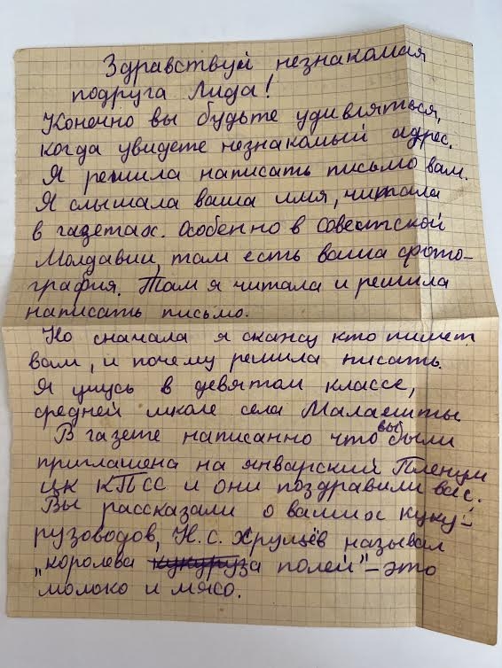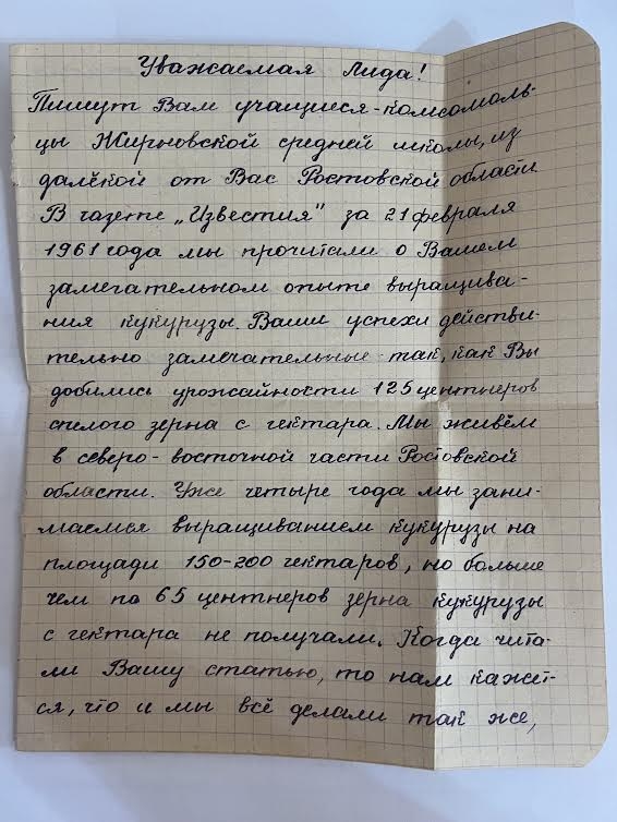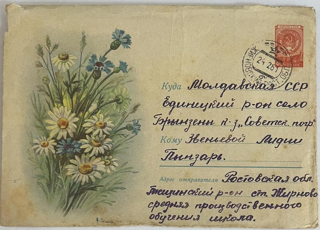 Scrisoare către Lidia Pînzari, MSSR, r.Edineț, s. Brînzeni, colhozul ”Garda de frontieră sovietică”, primită de la Ростовской области России, Тацинском районе, посёлок Жирнов, средняя производственного обучения скольих, средняя производственного обучения школа (Regiunea Rostov din Rusia, raionul Taținski, s. Jirnov, școala secundară industrială)