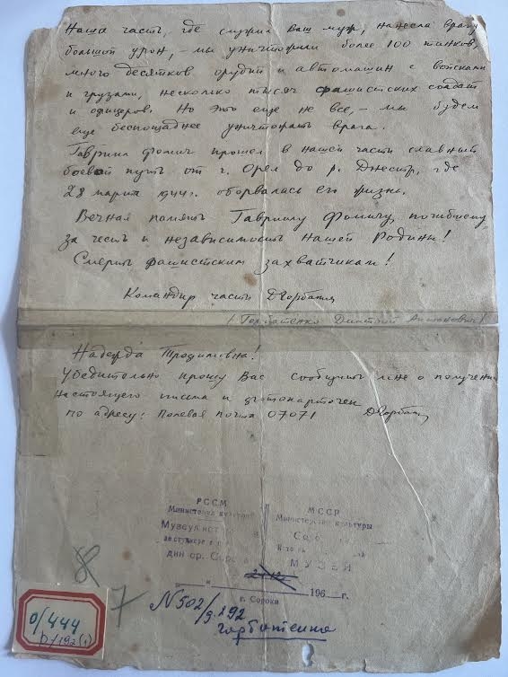 Scrisoarea comandantului Gorbațenko Dmitrii Anton, adresată către Nadejda Trofim, soția eroului în Marele Război pentru Apărarea Patriei - Sanduleac Gavriil Foma, care aunță despre moartea acestuia, și care a decedat la 28 martie 1944, după a treia rană cauzată din 26 martie 1944.
