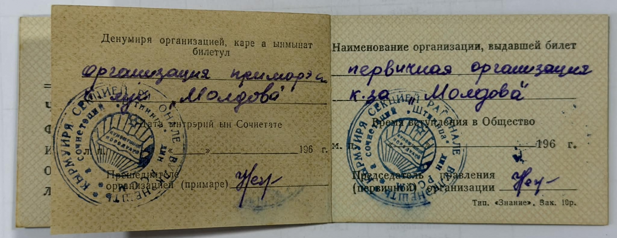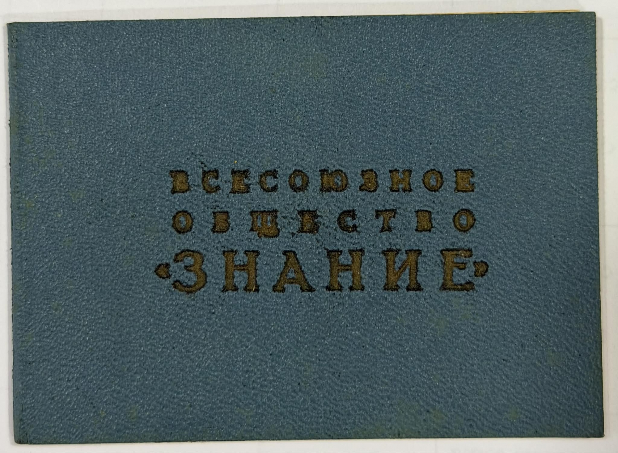 Documentul reprezintă o legitimație de membru al Societății „Znanie/Știința”, o organizație publică de educație și popularizare a științei din perioada sovietică. Partea stîngă conține cîmpurile scrise în limba rusă : Instituția emitentă, tipul de document, numărul, familia, numele, patronimicul și spațiul pentru semnătura (necompletat).