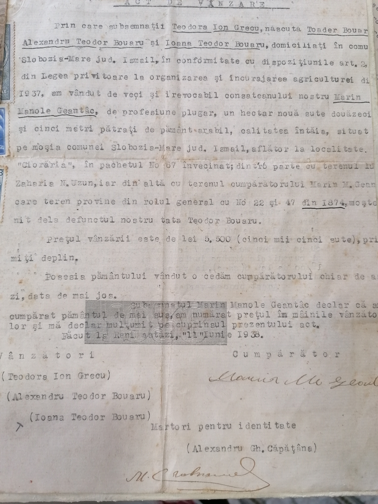 Documentul reprezintă un act de vânzare-cumpărare prin care vânzătorii Teodora Ion Grecu (născută Bouaru), Alexandru Teodor Bouaru și Ioana Teodor Bouaru declară că au vândut consăteanului lor Marin Manole Geantăc un teren arabil situat pe moșia comunei Slobozia-Mare, județul Ismail.