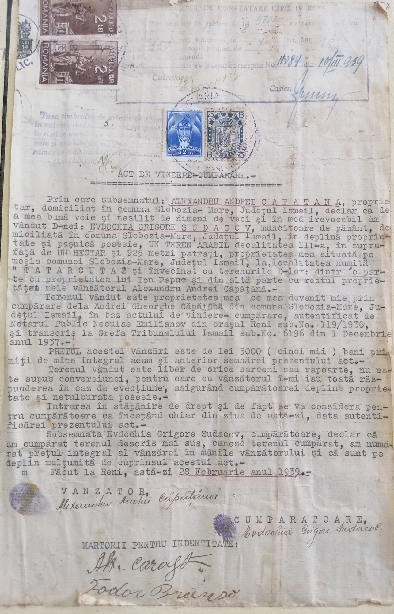 Documentul reprezintă un act de vânzare-cumpărare prin care vânzătorul Alexandru Andrei Căpățână declară că a vândut doamnei Evdochia Grigore Sudacov un teren arabil de calitatea a III-a, în suprafața de 1 ha și 925 m², și se află în locul numit „Tatarcuta”. Documentul precizează vecinătățile terenului, menționând terenul lui Ion Papuc și restul proprietății vânzătorului.