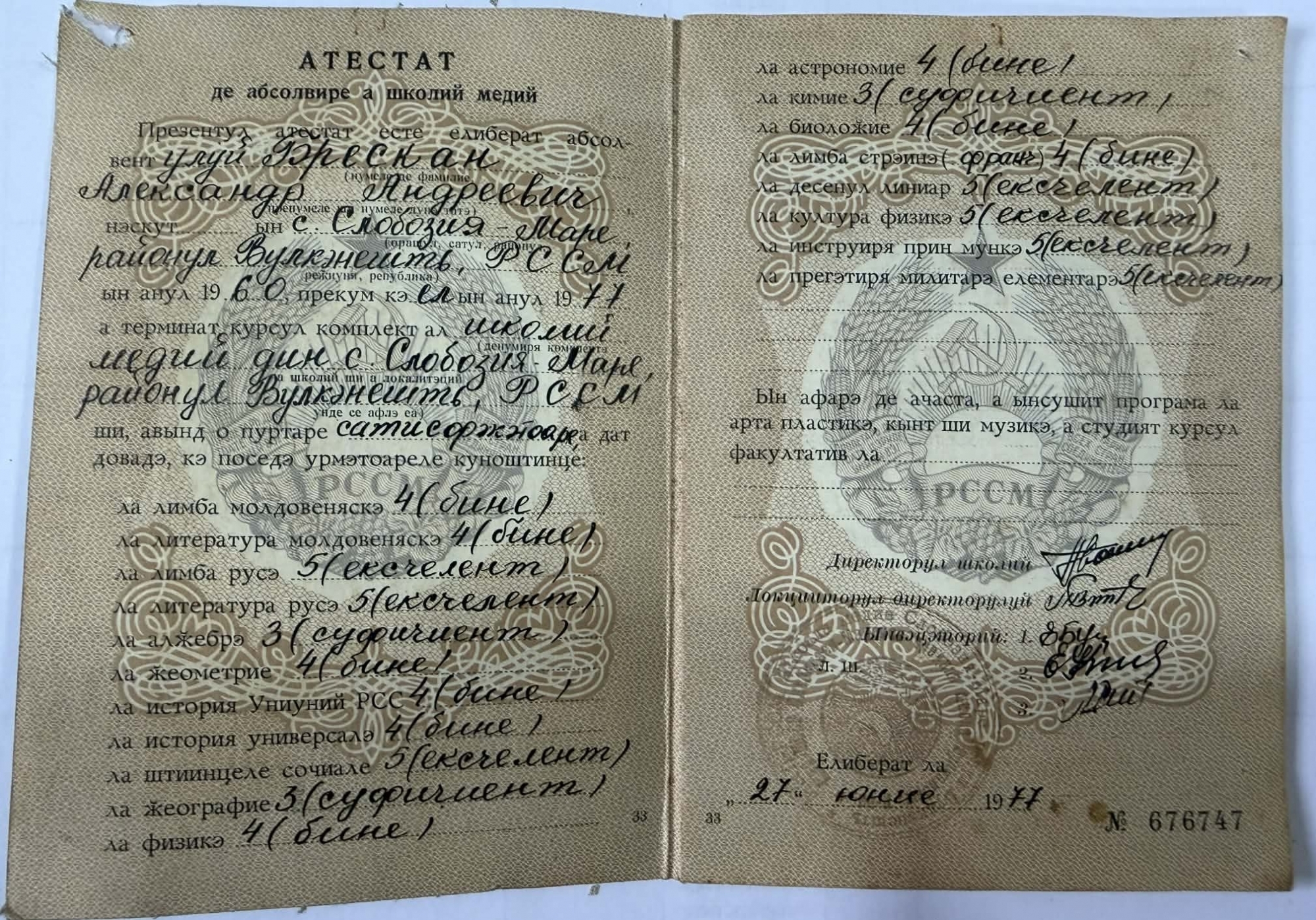 Document oficial care atestă absolvirea cursului complet al școlii medii din s. Slobozia Mare în anul 1977, pe numele lui Brescan Alexandru. Atestatul confirmă promovarea examenelor finale și conține lista disciplinelor studiate, cu notele obținute, conform sistemului de evaluare sovietic (note de la 3 – „satisfăcător” la 5 – „excelent”).