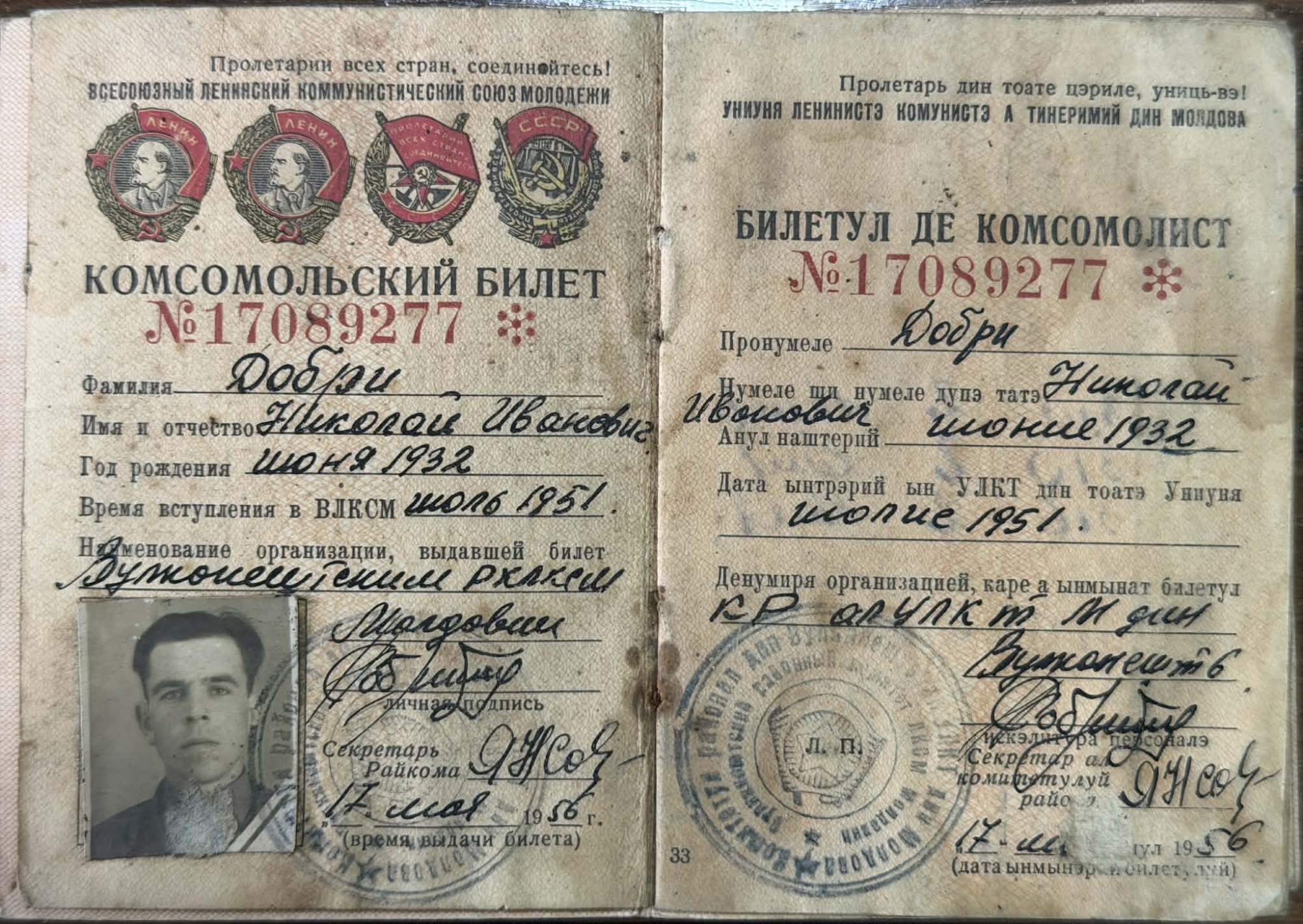 Bilet de Consomolist (Билетул де Комсомолист), eliberat în perioada Uniunii Sovietice, pe numele Dobri Nicolae. Documentul este bilingv, fiind redactat în rusă (partea stângă) și în limba română cu alfabet chirilic (partea dreaptă), specifică Republicii Sovietice Socialiste Moldovenești din acea vreme.