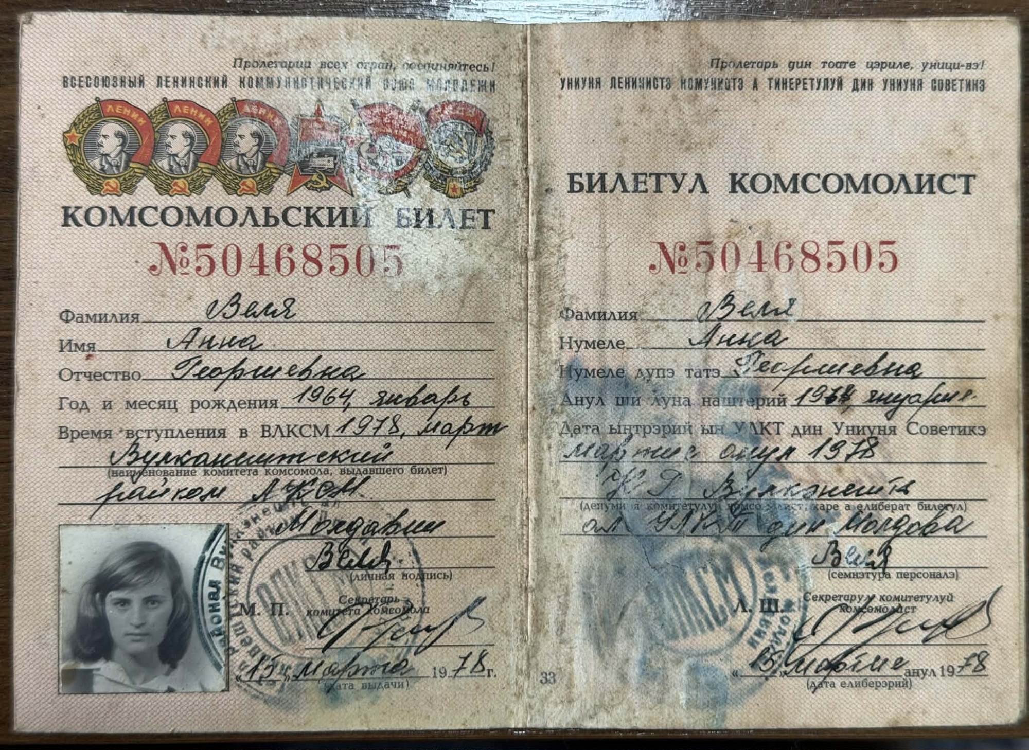 Bilet de membru al Uniunii Leniniste Comuniste a Tineretului (ULCT / ВЛКСМ) pe numele Velea Ana- Document de legitimare a membrului Uniunii Tineretului Comunist elaborat în două limbi: rusă (stânga) și moldovenească scrisă cu alfabet chirilic (dreapta). Coperta conține însemnele ULCT și simboluri sovietice: portretele în lanț ale lui Lenin și diverse embleme ale organizației de tineret.